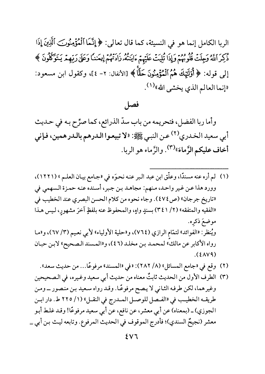 الربا الكامل إنما هو في النسيئة، كما قال تعالى: {إِنَّمَا الْمُؤْمِنُونَ الَّذِينَ إِذَا ذُكِرَ اللَّهُ وَجِلَتْ قُلُوبُهُمْ وَإِذَا تُلِيَتْ عَلَيْهِمْ آيَاتُهُ زَادَتْهُمْ إِيمَانًا وَعَلَى رَبِّهِمْ يَتَوَكَّلُونَ} إلى قوله: {أُولَئِكَ هُمُ الْمُؤْمِنُونَ حَقًّا} [الأنفال: ٢ - ٤]، وكقول ابن مسعود: «إنما العالم الذي يخشى الله» (¬١).