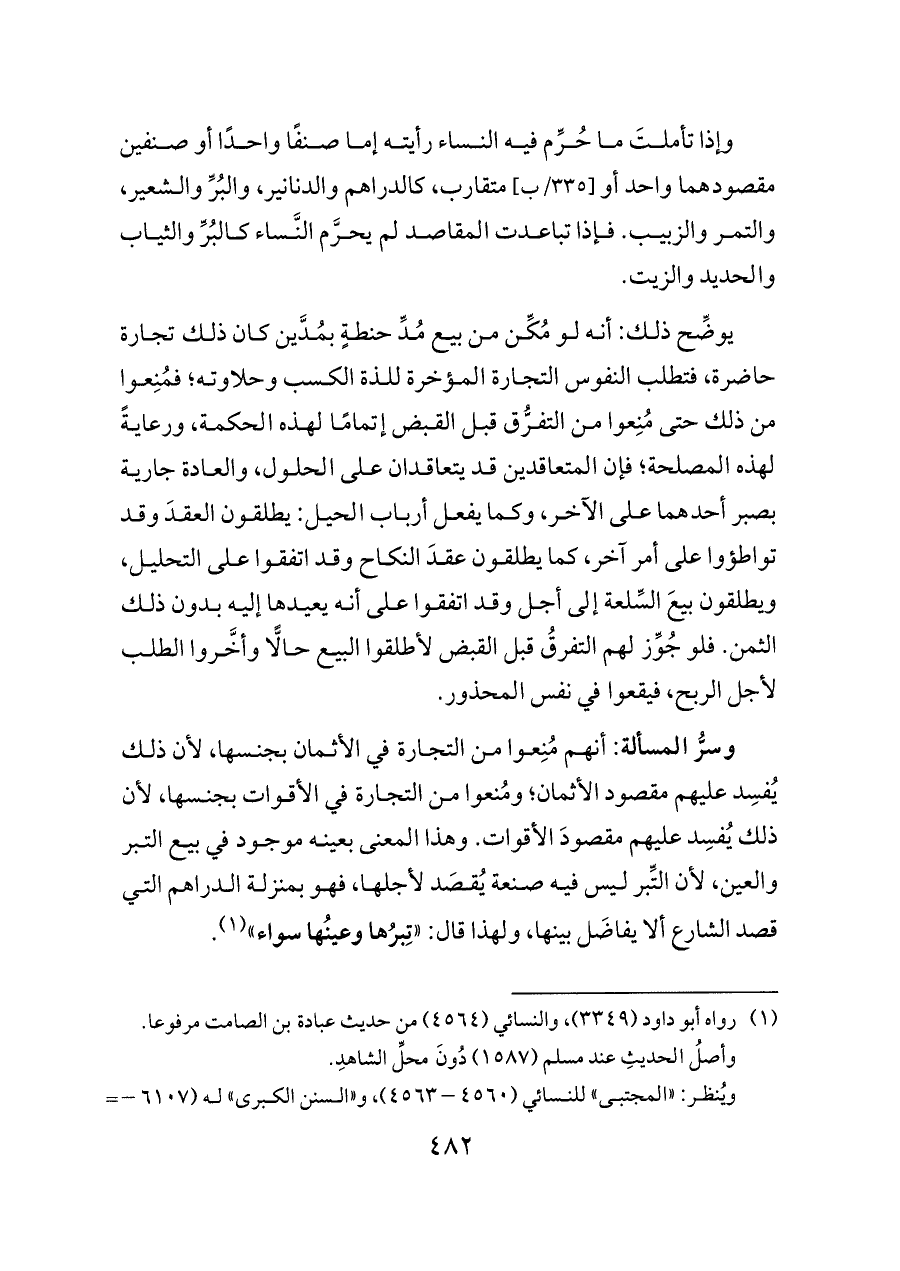 وإذا تأملتَ ما حُرِّم فيه النساء رأيته إما صنفًا واحدًا أو صنفين مقصودهما واحد أو [٣٣٥/ب] متقارب، كالدراهم والدنانير، والبُرِّ والشعير، والتمر والزبيب. فإذا تباعدت المقاصد لم يحرَّم النَّساء كالبُرِّ والثياب والحديد والزيت.