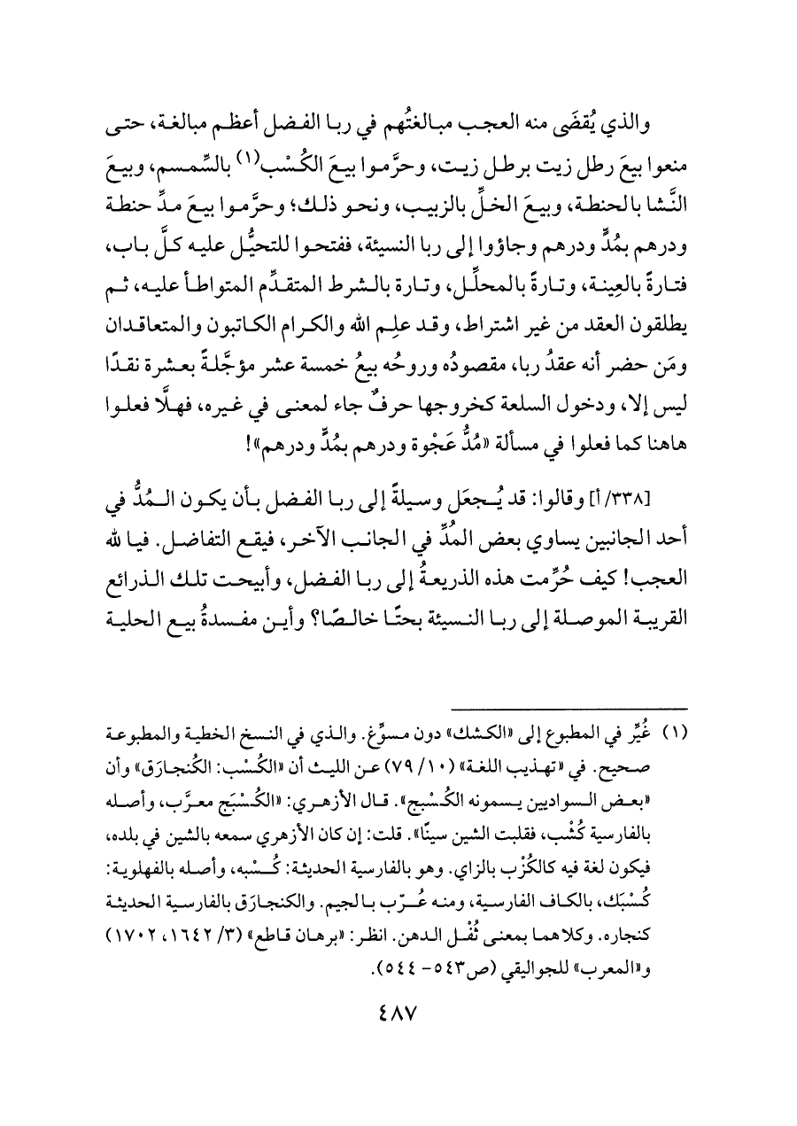 والذي يُقضَى منه العجب مبالغتُهم في ربا الفضل أعظم مبالغة، حتى منعوا بيعَ رطل زيت برطل زيت، وحرَّموا بيعَ الكُسْب (¬١) بالسِّمسم، وبيعَ النَّشا بالحنطة، وبيعَ الخلِّ بالزبيب، ونحو ذلك؛ وحرَّموا بيعَ مدِّ حنطة ودرهم بمُدٍّ ودرهم وجاؤوا إلى ربا النسيئة، ففتحوا للتحيُّل عليه كلَّ باب، فتارةً بالعِينة، وتارةً بالمحلِّل، وتارة بالشرط المتقدِّم المتواطأ عليه، ثم يطلقون العقد من غير اشتراط، وقد علِم الله والكرام الكاتبون والمتعاقدان ومَن حضر أنه عقدُ ربا، مقصودُه وروحُه بيعُ خمسة عشر مؤجَّلةً بعشرة نقدًا ليس إلا، ودخول السلعة كخروجها حرفٌ جاء لمعنى في غيره، فهلَّا فعلوا هاهنا كما فعلوا في مسألة «مُدُّ عَجْوة ودرهم بمُدٍّ ودرهم»!