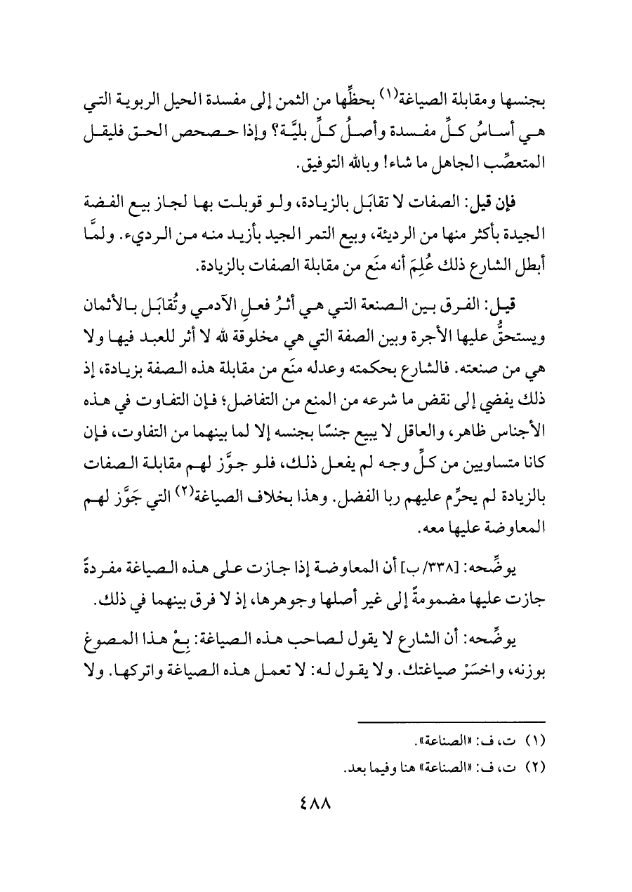 يوضِّحه: أن الشارع لا يقول لصاحب هذه الصياغة: بِعْ هذا المصوغ بوزنه، واخسَرْ صياغتك. ولا يقول له: لا تعمل هذه الصياغة واتركها. ولا