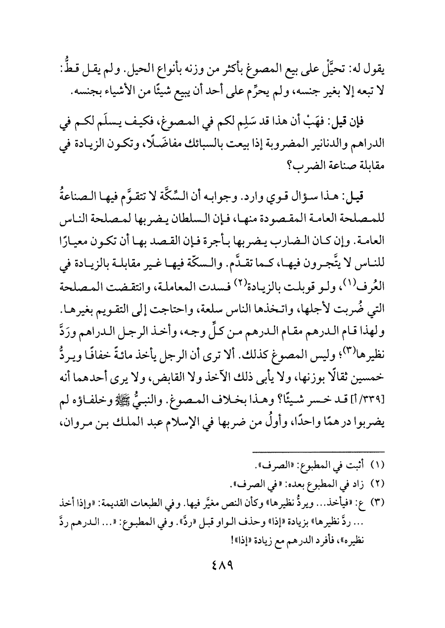 فإن قيل: فهَبْ أن هذا قد سَلِم لكم في المصوغ، فكيف يسلَم لكم في الدراهم والدنانير المضروبة إذا بيعت بالسبائك مفاضَلًا، وتكون الزيادة في مقابلة صناعة الضرب؟