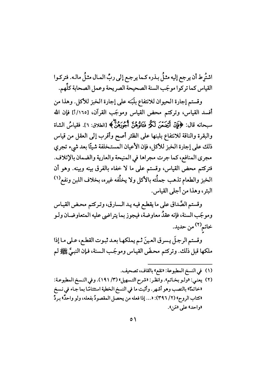 وقستم إجارة الحيوان للانتفاع بلَبَنه على إجارة الخبز للأكل. وهذا من أفسد القياس، وتركتم محض القياس وموجَب القرآن، [١٦٥/أ] فإن الله سبحانه قال: {فَإِنْ أَرْضَعْنَ لَكُمْ فَآتُوهُنَّ أُجُورَهُنَّ} [الطلاق: ٦]. فقياسُ الشاة والبقرة والناقة للانتفاع بلبنها على الظئر أصح وأقرب إلى العقل من قياس ذلك على إجارة الخبز للأكل، فإن الأعيان المستخلفة شيئًا بعد شيء تجري مجرى المنافع، كما جرت مجراها في المنيحة والعارية والضمان بالإتلاف. فتركتم محض القياس، وقستم على ما لا خفاء بالفرق بينه وبينه. وهو أن الخبز والطعام تذهب جملُته بالأكل ولا يخلُفه غيره، بخلاف اللبن ونفع (¬١) البئر، وهذا من أجلى القياس.