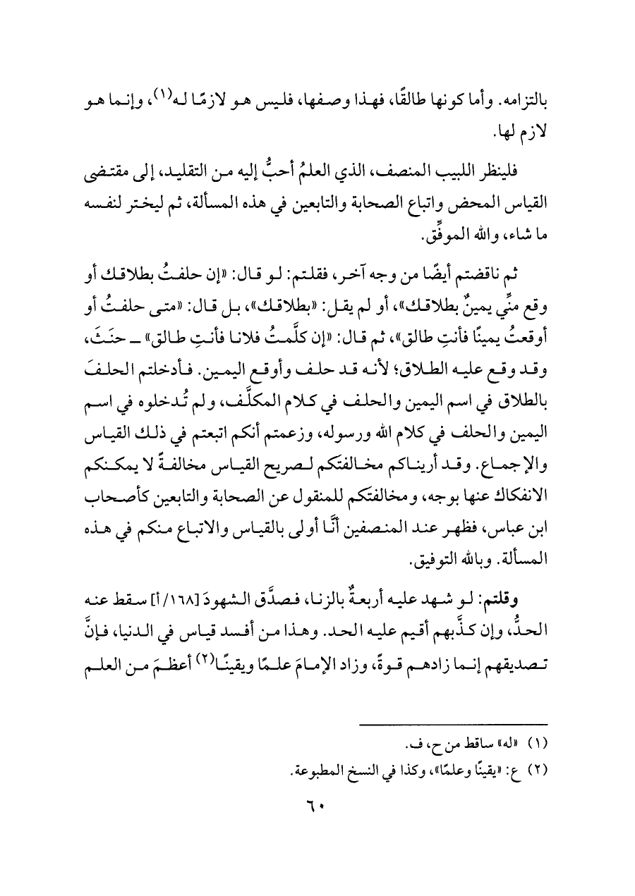 ثم ناقضتم أيضًا من وجه آخر، فقلتم: لو قال: «إن حلفتُ بطلاقك أو وقع منِّي يمينٌ بطلاقك»، أو لم يقل: «بطلاقك»، بل قال: «متى حلفتُ أو أوقعتُ يمينًا فأنتِ طالق»، ثم قال: «إن كلَّمتُ فلانا فأنتِ طالق» ــ حنَثَ، وقد وقع عليه الطلاق؛ لأنه قد حلف وأوقع اليمين. فأدخلتم الحلفَ بالطلاق في اسم اليمين والحلف في كلام المكلَّف، ولم تُدخلوه في اسم اليمين والحلف في كلام الله ورسوله، وزعمتم أنكم اتبعتم في ذلك القياس والإجماع. وقد أريناكم مخالفتَكم لصريح القياس مخالفةً لا يمكنكم الانفكاك عنها بوجه، ومخالفتَكم للمنقول عن الصحابة والتابعين كأصحاب ابن عباس، فظهر عند المنصفين أنَّا أولى بالقياس والاتباع منكم في هذه المسألة. وبالله التوفيق.