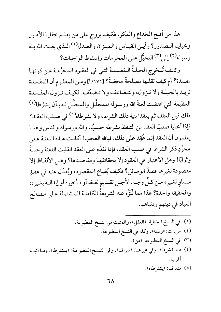 وكيف تُخرِج الحيلةُ المَفسدةَ التي في العقود المحرَّمة عن كونها مفسدة؟ أم كيف تقلبها مصلحةً محضةً؟ [١٧١/أ] ومن المعلوم أن المفسدة تزيد بالحيلة ولا تزول، وتتضاعف ولا تضعُف. فكيف تزول المفسدة العظيمة التي اقتضت لعنةَ الله ورسوله للمحلِّل والمحلَّل له بأن يشرُطا (¬٤) ذلك قبل العقد، ثم يعقدا بنية ذلك الشرط، ولا يشرطاه (¬٥) في صلب العقد؟ فإذا أخليا صلبَ العقد من التلفظ بشرطه حسبُ، والله ورسوله والناس وهما يعلمون أن العقد إنما عُقِد على ذلك. فيالله العجب! أكانت هذه اللعنة على مجرَّدِ ذكر الشرط في صلب العقد، فإذا تقدَّم على العقد انقلبت اللعنة رحمةً وثوابًا! وهل الاعتبار في العقود إلا بحقائقها ومقاصدها؟ وهل الألفاظ إلا مقصودة لغيرها قصدَ الوسائل؟ فكيف يُضاع المقصود، ويُعدَل عنه في عقدٍ مساوٍ لغيره من كلِّ وجه، لأجل تقديم لفظ أو تأخيره أو إبداله بغيره، والحقيقة واحدة؟ هذا مما تُنَزَّه عنه الشريعةُ الكاملة المشتملة على مصالح العباد في دينهم ودنياهم.