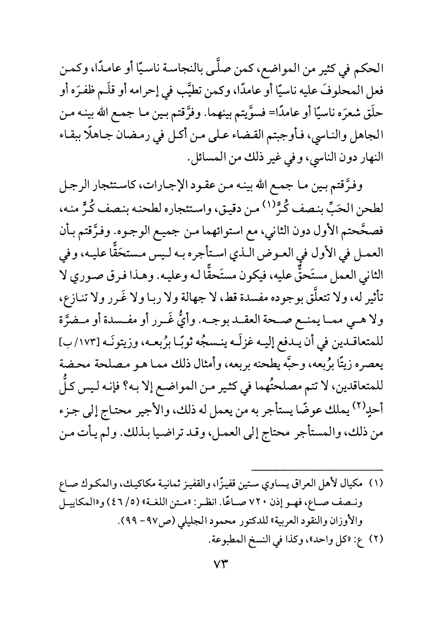 الحكم في كثير من المواضع، كمن صلَّى بالنجاسة ناسيًا أو عامدًا، وكمن فعل المحلوفَ عليه ناسيًا أو عامدًا، وكمن تطيَّب في إحرامه أو قلَم ظفرَه أو حلَق شعرَه ناسيًا أو عامدًا= فسوَّيتم بينهما. وفرَّقتم بين ما جمع الله بينه من الجاهل والناسي، فأوجبتم القضاء على من أكل في رمضان جاهلًا ببقاء النهار دون الناسي، وفي غير ذلك من المسائل.