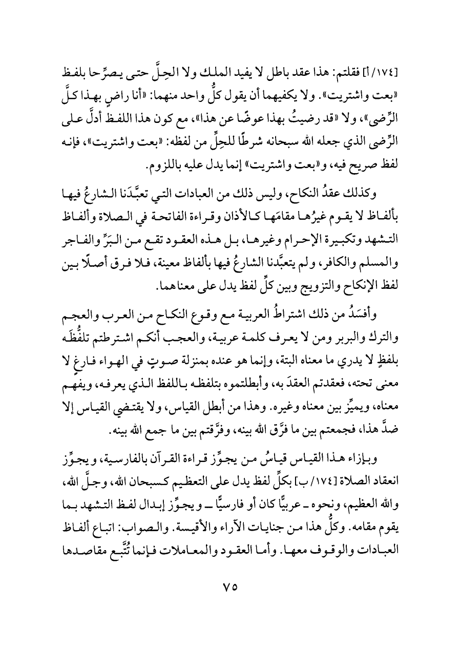 وبإزاء هذا القياس قياسُ من يجوِّز قراءة القرآن بالفارسية، ويجوِّز انعقاد الصلاة [١٧٤/ب] بكلِّ لفظ يدل على التعظيم كسبحان الله، وجلَّ الله، والله العظيم، ونحوه ــ عربيًّا كان أو فارسيًّا ــ ويجوِّز إبدال لفظ التشهد بما يقوم مقامه. وكلُّ هذا من جنايات الآراء والأقيسة. والصواب: اتباع ألفاظ العبادات والوقوف معها. وأما العقود والمعاملات فإنما تُتَّبع مقاصدها