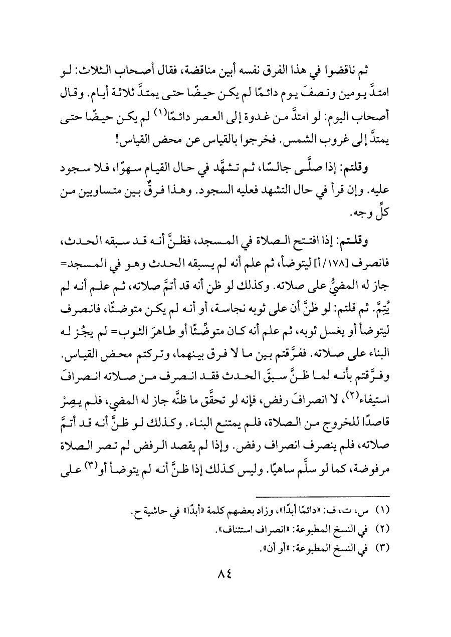 وقلتم: إذا افتتح الصلاة في المسجد، فظنَّ أنه قد سبقه الحدث، فانصرف [١٧٨/أ] ليتوضأ، ثم علم أنه لم يسبقه الحدث وهو في المسجد= جاز له المضيُّ على صلاته. وكذلك لو ظن أنه قد أتمَّ صلاته، ثم علم أنه لم يُتِمَّ. ثم قلتم: لو ظنَّ أن على ثوبه نجاسة، أو أنه لم يكن متوضئًا، فانصرف ليتوضأ أو يغسل ثوبه، ثم علم أنه كان متوضِّئًا أو طاهرَ الثوب= لم يجُز له البناء على صلاته. ففرَّقتم بين ما لا فرق بينهما، وتركتم محض القياس. وفرَّقتم بأنه لما ظنَّ سبقَ الحدث فقد انصرف من صلاته انصرافَ استيفاء (¬٢)، لا انصرافَ رفض، فإنه لو تحقَّق ما ظنَّه جاز له المضي، فلم يصِرْ قاصدًا للخروج من الصلاة، فلم يمتنع البناء. وكذلك لو ظنَّ أنه قد أتمَّ صلاته، فلم ينصرف انصراف رفض. وإذا لم يقصد الرفض لم تصر الصلاة مرفوضة، كما لو سلَّم ساهيًا. وليس كذلك إذا ظنَّ أنه لم يتوضأ أو (¬٣) على