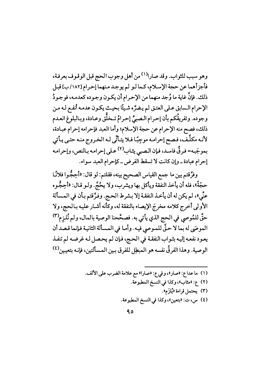 وفرَّقتم بين ما جمع القياس الصحيح بينه، فقلتم: لو قال: «أحِجُّوا فلانًا حجّةً»، فله أن يأخذ النفقة ويأكل بها ويشرب، ولا يحُجَّ. ولو قال: «أحِجُّوه عنِّي»، لم يكن له أن يأخذ النفقة إلا بشرط الحج. وفرَّقتم بأن في المسألة الأولى أخرج كلامه مخرجَ الإيصاء بالنفقة له، وكأنه أشار عليه بالحج، ولا حقَّ للمُوصي في الحج الذي يأتي به. فصحَّحنا الوصية بالمال، ولم نُلزِم (¬٣) الموصَى له بما لا حقَّ للموصي فيه. وأما في المسألة الثانية فإنما قصد أن يعود نفعه إليه بثواب النفقة في الحج، فإن لم يحصل له غرضه لم تنفذ الوصية. وهذا الفرقُ نفسه هو المبطِل للفرق بين المسألتين، فإنه بتعيين (¬٤)