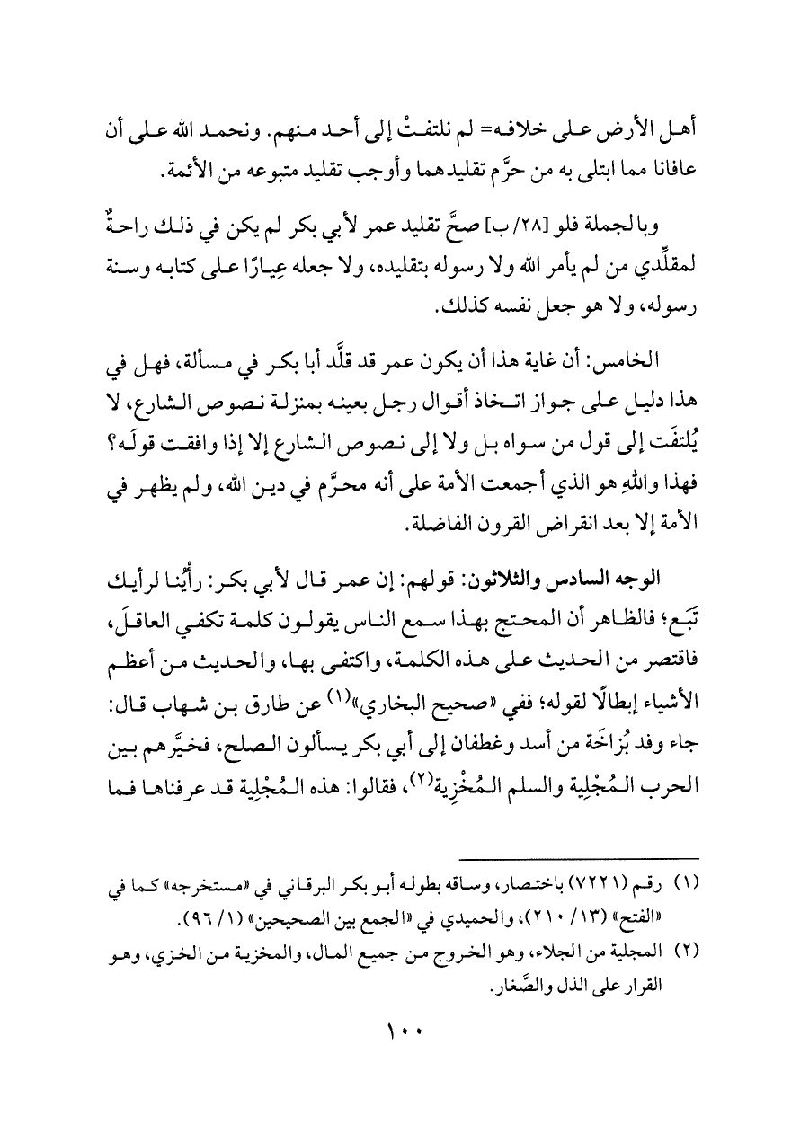 الوجه السادس والثلاثون: قولهم: إن عمر قال لأبي بكر: رأْيُنا لرأيك تَبَع؛ فالظاهر أن المحتج بهذا سمع الناس يقولون كلمة تكفي العاقلَ، فاقتصر من الحديث على هذه الكلمة، واكتفى بها، والحديث من أعظم الأشياء إبطالًا لقوله؛ ففي «صحيح البخاري» (¬١) عن طارق بن شهاب قال: جاء وفد بُزاخَة من أسد وغطفان إلى أبي بكر يسألون الصلح، فخيَّرهم بين الحرب المُجْلِية والسلم المُخْزِية (¬٢)، فقالوا: هذه المُجْلِية قد عرفناها فما