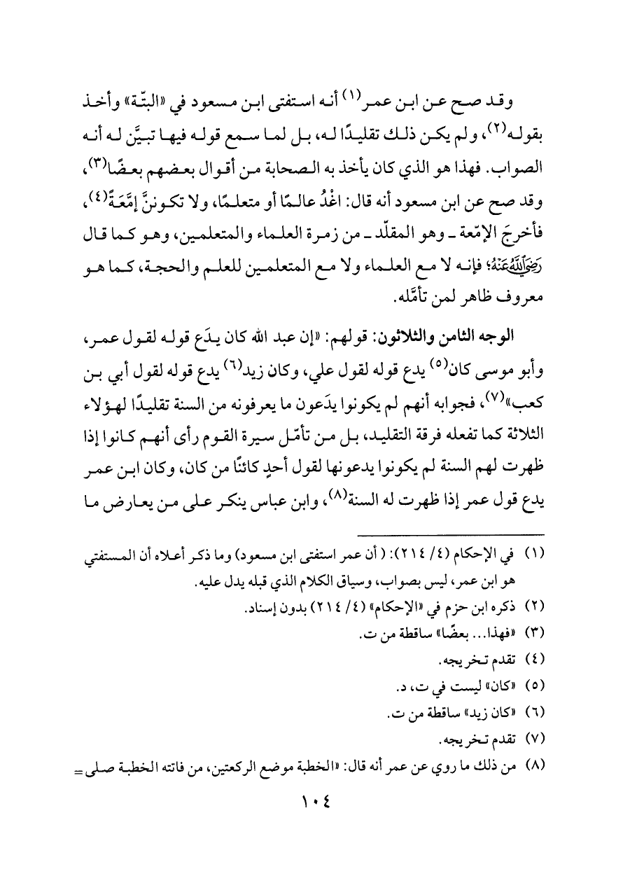 وقد صح عن ابن عمر (¬١) أنه استفتى ابن مسعود في «البتّة» وأخذ بقوله (¬٢)، ولم يكن ذلك تقليدًا له، بل لما سمع قوله فيها تبيَّن له أنه الصواب. فهذا هو الذي كان يأخذ به الصحابة من أقوال بعضهم بعضًا (¬٣)، وقد صح عن ابن مسعود أنه قال: اغْدُ عالمًا أو متعلمًا، ولا تكوننَّ إمَّعَةً (¬٤)، فأخرجَ الإمّعة ــ وهو المقلّد ــ من زمرة العلماء والمتعلمين، وهو كما قال - رضي الله عنه -؛ فإنه لا مع العلماء ولا مع المتعلمين للعلم والحجة، كما هو معروف ظاهر لمن تأمَّله.