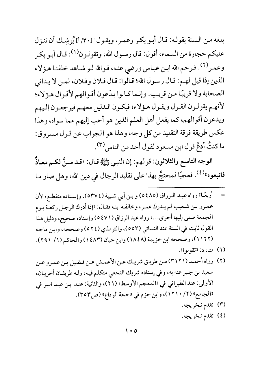 الوجه التاسع والثلاثون: قولهم: إن النبي - صلى الله عليه وسلم - قال: «قد سنَّ لكم معاذٌ فاتبعوه» (¬٤). فعجبًا لمحتجٍّ بهذا على تقليد الرجال في دين الله، وهل صار ما
