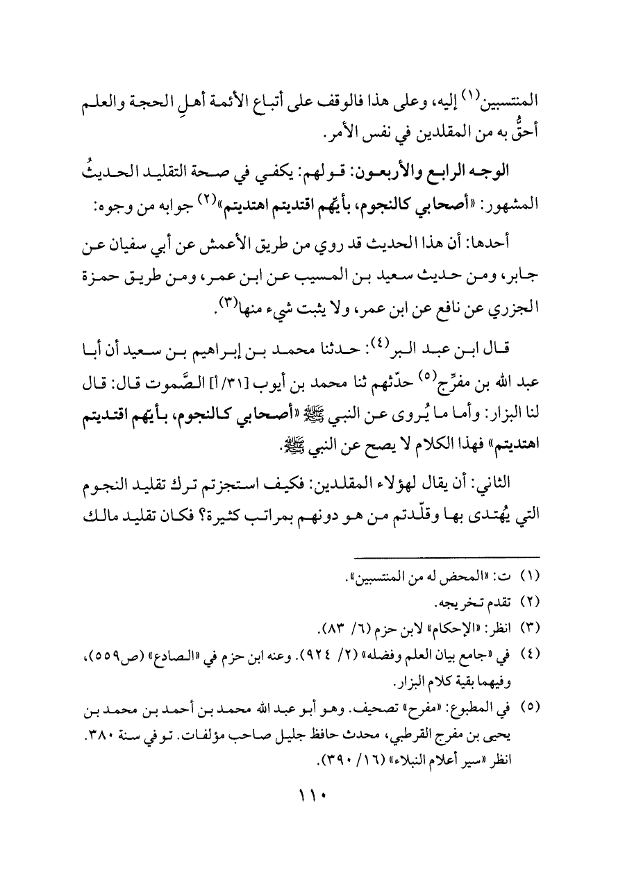 الوجه الرابع والأربعون: قولهم: يكفي في صحة التقليد الحديثُ المشهور: «أصحابي كالنجوم، بأيِّهم اقتديتم اهتديتم» (¬٢) جوابه من وجوه: