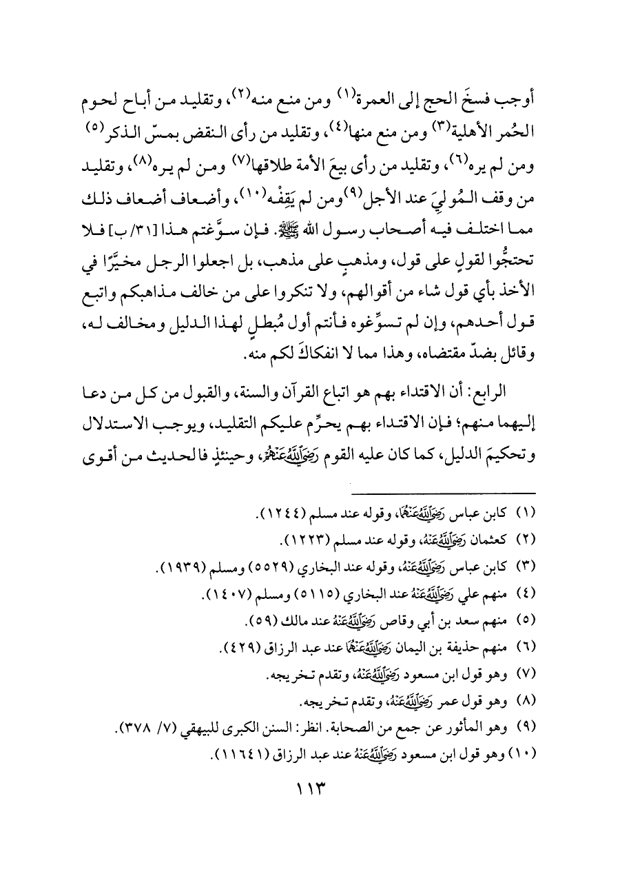 أوجب فسخَ الحج إلى العمرة (¬١) ومن منع منه (¬٢)، وتقليد من أباح لحوم الحُمر الأهلية (¬٣) ومن منع منها (¬٤)، وتقليد من رأى النقض بمسّ الذكر (¬٥) ومن لم يره (¬٦)، وتقليد من رأى بيعَ الأمة طلاقها (¬٧) ومن لم يره (¬٨)،