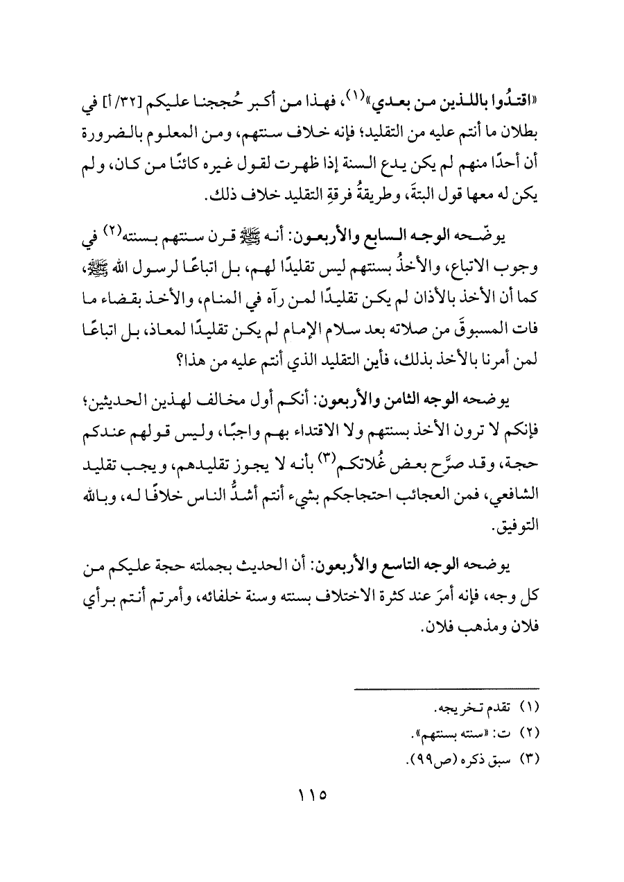 يوضحه الوجه الثامن والأربعون: أنكم أول مخالف لهذين الحديثين؛ فإنكم لا ترون الأخذ بسنتهم ولا الاقتداء بهم واجبًا، وليس قولهم عندكم حجة، وقد صرَّح بعض غُلاتكم (¬٣) بأنه لا يجوز تقليدهم، ويجب تقليد الشافعي، فمن العجائب احتجاجكم بشيء أنتم أشدُّ الناس خلافًا له، وبالله التوفيق.