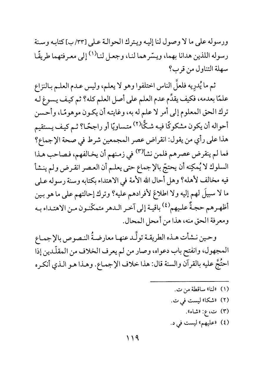 ثم ما يُدرِيه فلعلَّ الناس اختلفوا وهو لا يعلم، وليس عدم العلم بالنزاع علمًا بعدمه، فكيف يقدِّم عدم العلم على أصل العلم كله؟ ثم كيف يسوغ له ترك الحق المعلوم إلى أمر لا علم له به، وغايته أن يكون موهومًا، وأحسن أحواله أن يكون مشكوكًا فيه شكًّا (¬٢) متساويًا أو راجحًا؟ ثم كيف يستقيم هذا على رأي من يقول: انقراض عصر المجمعين شرط في صحة الإجماع؟ فما لم ينقرض عصرهم فلمن نشأ (¬٣) في زمنهم أن يخالفهم، فصاحب هذا السلوك لا يُمكِنه أن يحتجّ بالإجماع حتى يعلم أن العصر انقرض ولم ينشأ فيه مخالف لأهله؟ وهل أحال الله الأمة في الاهتداء بكتابه وسنة رسوله على ما لا سبيلَ لهم إليه ولا اطلاعَ لأفرادهم عليه؟ وترك إحالتهم على ما هو بين أظهرهم حجةٌ عليهم (¬٤) باقية إلى آخر الدهر متمكّنون من الاهتداء به ومعرفة الحق منه، هذا من أمحل المحال.