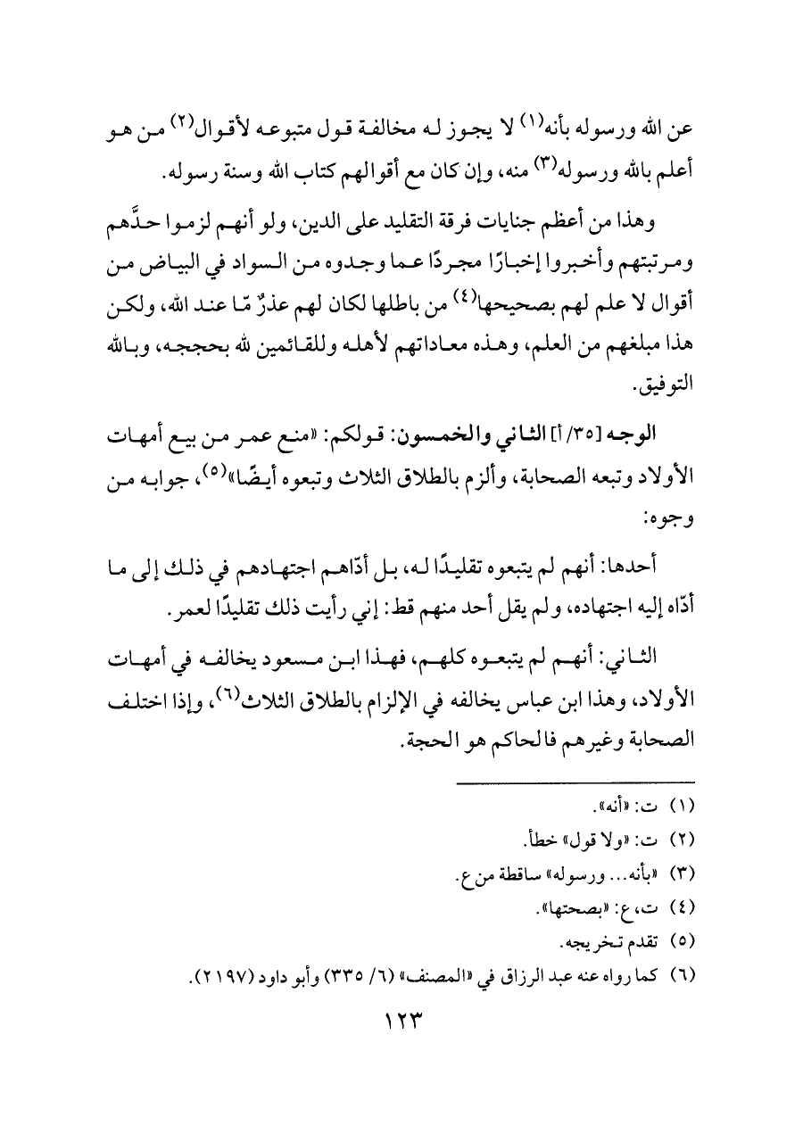 الوجه [٣٥/أ] الثاني والخمسون: قولكم: «منع عمر من بيع أمهات الأولاد وتبعه الصحابة، وألزم بالطلاق الثلاث وتبعوه أيضًا» (¬٥)، جوابه من وجوه: