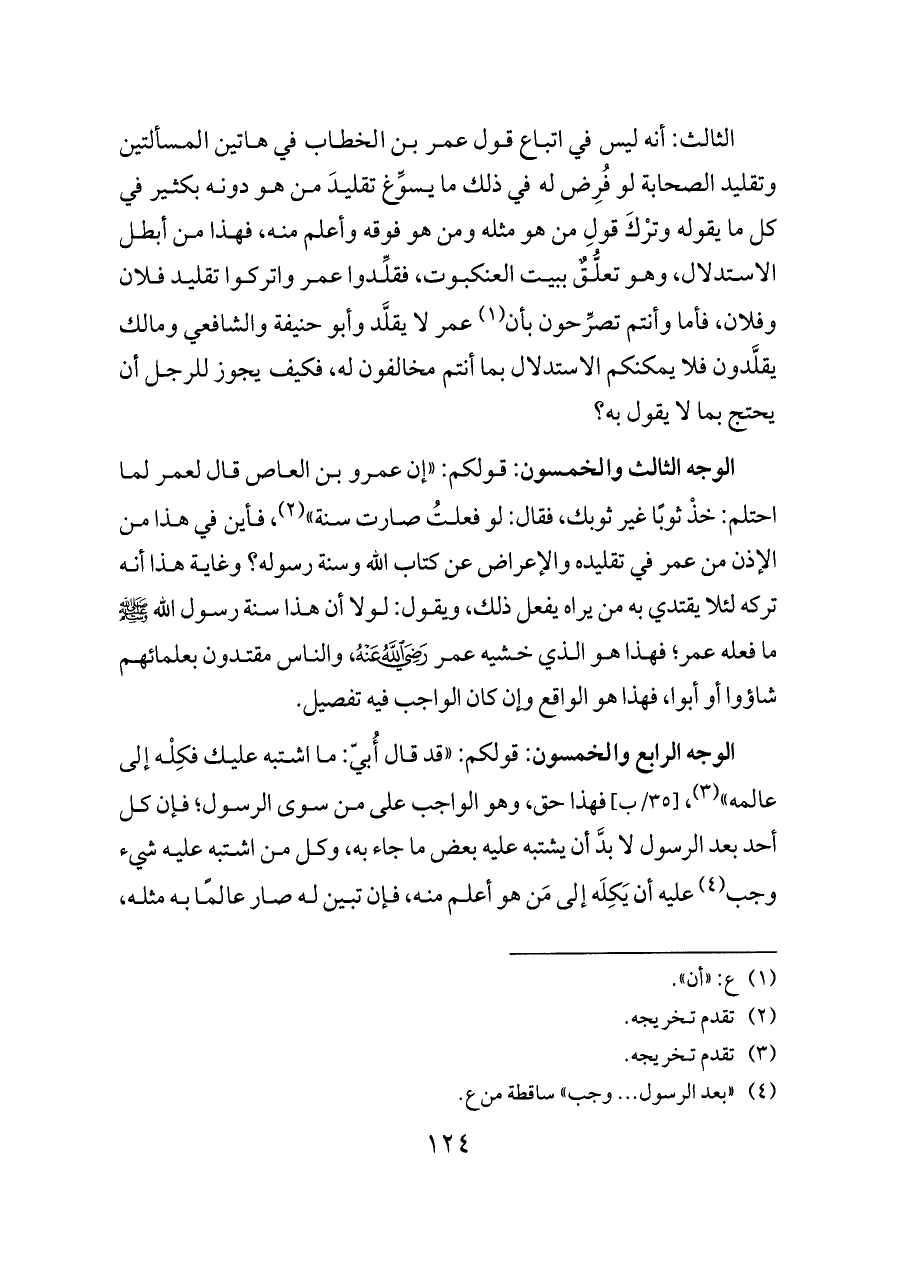 الوجه الثالث والخمسون: قولكم: «إن عمرو بن العاص قال لعمر لما احتلم: خذْ ثوبًا غير ثوبك، فقال: لو فعلتُ صارت سنة» (¬٢)، فأين في هذا من الإذن من عمر في تقليده والإعراض عن كتاب الله وسنة رسوله؟ وغاية هذا أنه تركه لئلا يقتدي به من يراه يفعل ذلك، ويقول: لولا أن هذا سنة رسول الله - صلى الله عليه وسلم - ما فعله عمر؛ فهذا هو الذي خشيه عمر - رضي الله عنه -، والناس مقتدون بعلمائهم شاؤوا أو أبوا، فهذا هو الواقع وإن كان الواجب فيه تفصيل.