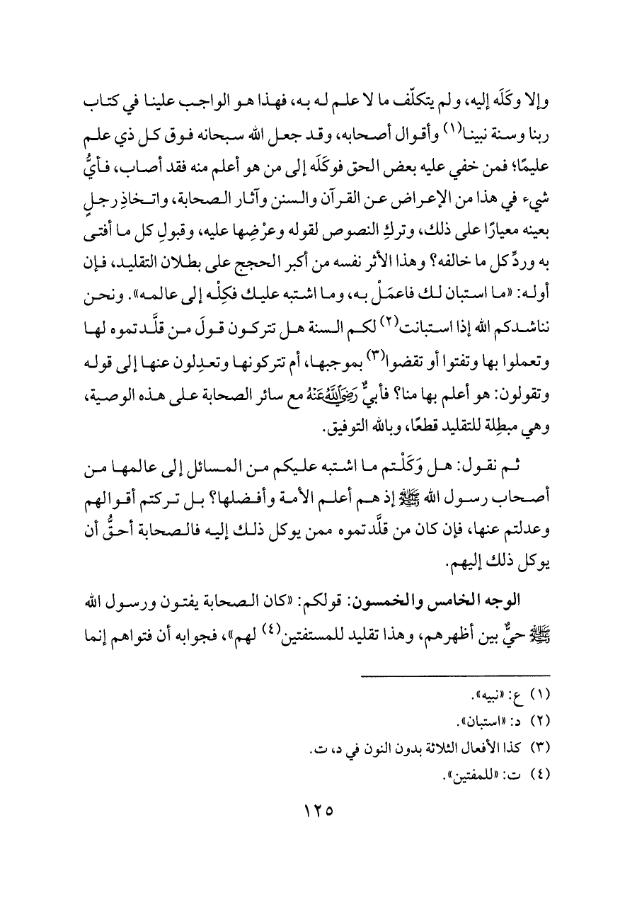 ثم نقول: هل وَكَلْتم ما اشتبه عليكم من المسائل إلى عالمها من أصحاب رسول الله - صلى الله عليه وسلم - إذ هم أعلم الأمة وأفضلها؟ بل تركتم أقوالهم وعدلتم عنها، فإن كان من قلَّدتموه ممن يوكل ذلك إليه فالصحابة أحقُّ أن يوكل ذلك إليهم.