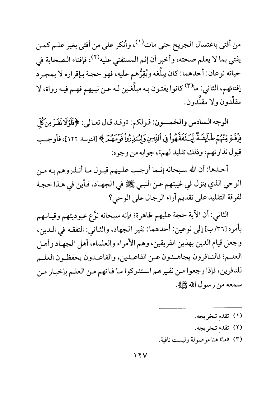 الوجه السادس والخمسون: قولكم: «وقد قال تعالى: {فَلَوْلَا نَفَرَ مِنْ كُلِّ فِرْقَةٍ مِنْهُمْ طَائِفَةٌ لِيَتَفَقَّهُوا فِي الدِّينِ وَلِيُنْذِرُوا قَوْمَهُمْ} [التوبة: ١٢٢]، فأوجب قبول نذارتهم، وذلك تقليد لهم»، جوابه من وجوه: