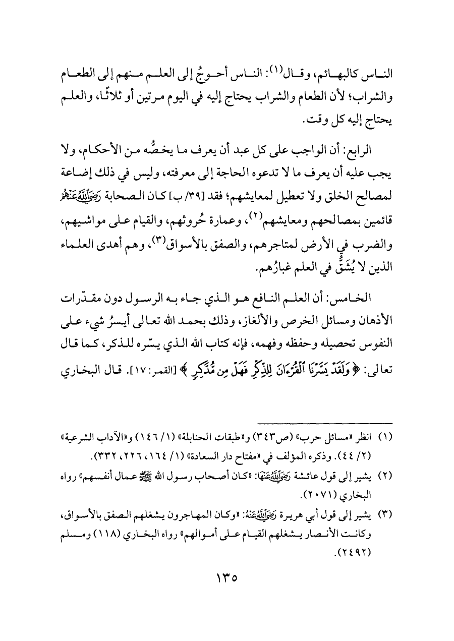 الرابع: أن الواجب على كل عبد أن يعرف ما يخصُّه من الأحكام، ولا يجب عليه أن يعرف ما لا تدعوه الحاجة إلى معرفته، وليس في ذلك إضاعة لمصالح الخلق ولا تعطيل لمعايشهم؛ فقد [٣٩/ب] كان الصحابة - رضي الله عنهم - قائمين بمصالحهم ومعايشهم (¬٢)، وعمارة حُروثهم، والقيام على مواشيهم، والضرب في الأرض لمتاجرهم، والصفق بالأسواق (¬٣)، وهم أهدى العلماء الذين لا يُشَقُّ في العلم غبارُهم.