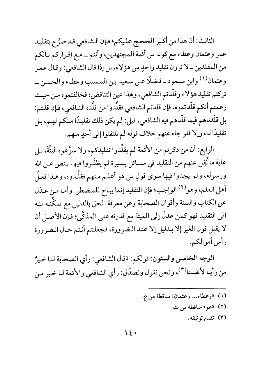 الثالث: أن هذا من أكبر الحجج عليكم؛ فإن الشافعي قد صرَّح بتقليد عمر وعثمان وعطاء مع كونه من أئمة المجتهدين، وأنتم ــ مع إقراركم بأنكم من المقلدين ــ لا ترون تقليد واحدٍ من هؤلاء، بل إذا قال الشافعي: وقال عمر وعثمان (¬١) وابن مسعود ــ فضلًا عن سعيد بن المسيب وعطاء والحسن ــ تركتم تقليد هؤلاء وقلّدتم الشافعي، وهذا عين التناقض؛ فخالفتموه من حيث زعمتم أنكم قلّدتموه، فإن قلدتم الشافعي فقلِّدوا من قلَّده الشافعي، فإن قلتم: بل قلّدناهم فيما قلّدهم فيه الشافعي، قيل: لم يكن ذلك تقليدًا منكم لهم، بل تقليدًا له، وإلا فلو جاء عنهم خلاف قوله لم تلتفتوا إلى أحدٍ منهم.