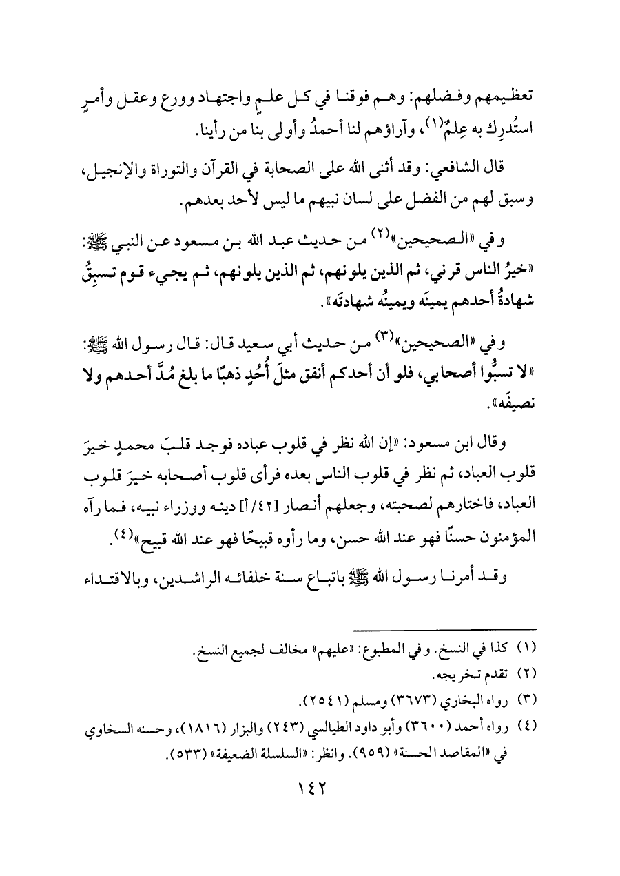تعظيمهم وفضلهم: وهم فوقنا في كل علمٍ واجتهاد وورع وعقل وأمرٍ استُدرِك به عِلمٌ (¬١)، وآراؤهم لنا أحمدُ وأولى بنا من رأينا.