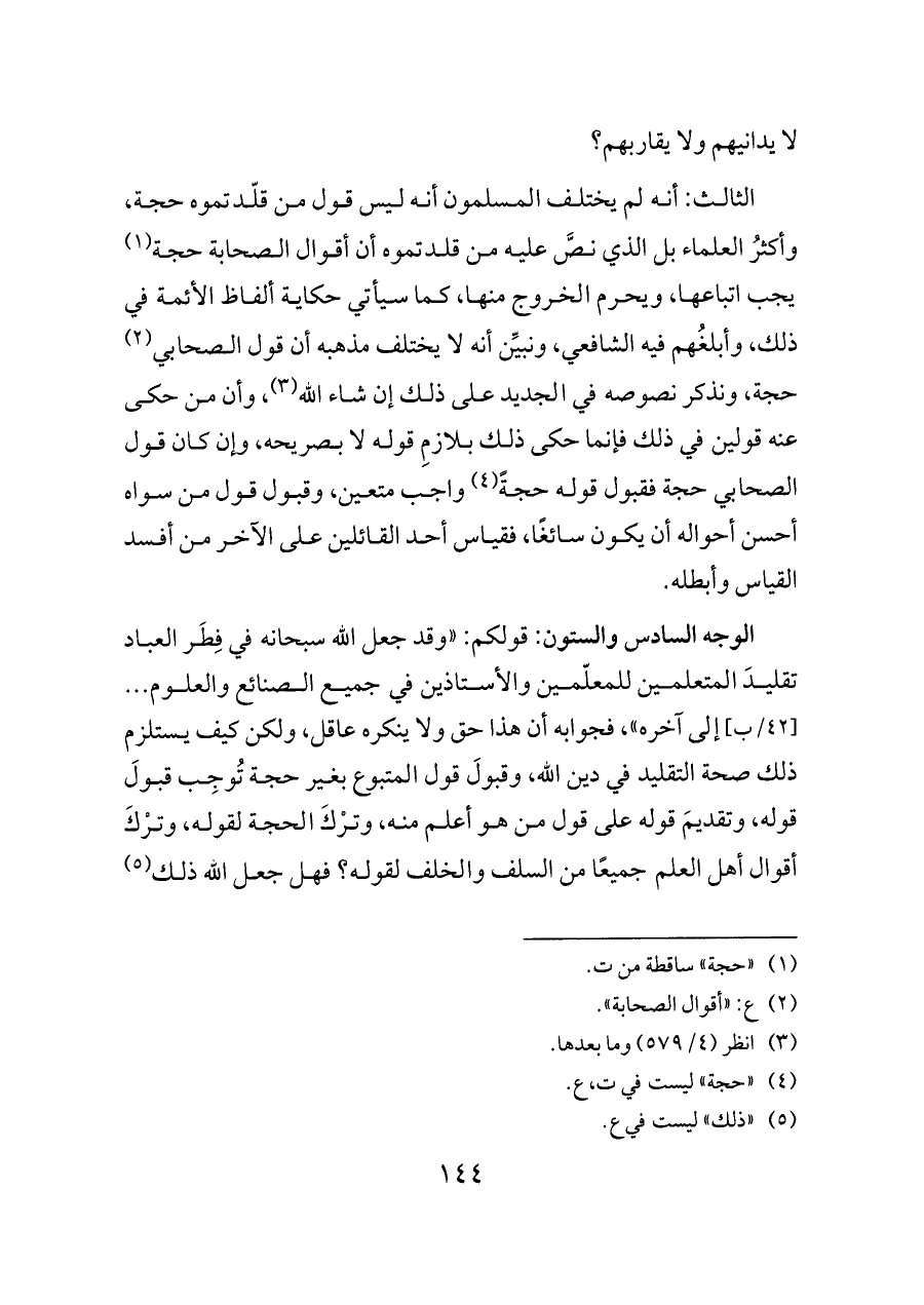 الثالث: أنه لم يختلف المسلمون أنه ليس قول من قلّدتموه حجة، وأكثرُ العلماء بل الذي نصَّ عليه من قلدتموه أن أقوال الصحابة حجة (¬١) يجب اتباعها، ويحرم الخروج منها، كما سيأتي حكاية ألفاظ الأئمة في ذلك، وأبلغُهم فيه الشافعي، ونبيِّن أنه لا يختلف مذهبه أن قول الصحابي (¬٢) حجة، ونذكر نصوصه في الجديد على ذلك إن شاء الله (¬٣)، وأن من حكى عنه قولين في ذلك فإنما حكى ذلك بلازمِ قوله لا بصريحه، وإن كان قول الصحابي حجة فقبول قوله حجةً (¬٤) واجب متعين، وقبول قول من سواه أحسن أحواله أن يكون سائغًا، فقياس أحد القائلين على الآخر من أفسد القياس وأبطله.