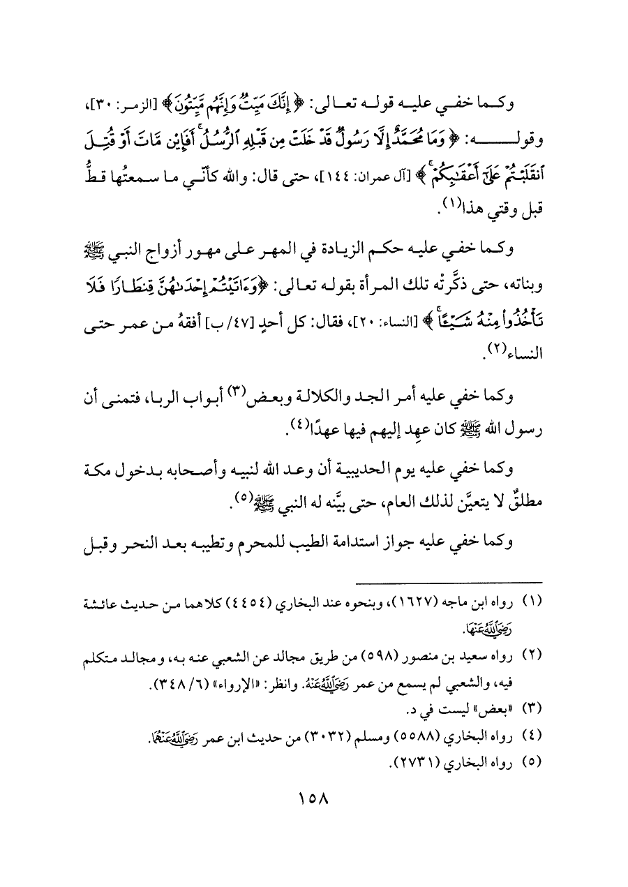 وكما خفي عليه قوله تعالى: {إِنَّكَ مَيِّتٌ وَإِنَّهُمْ مَيِّتُونَ} [الزمر: ٣٠]، وقوله: {وَمَا مُحَمَّدٌ إِلَّا رَسُولٌ قَدْ خَلَتْ مِنْ قَبْلِهِ الرُّسُلُ أَفَإِنْ مَاتَ أَوْ قُتِلَ انْقَلَبْتُمْ عَلَى أَعْقَابِكُمْ} [آل عمران: ١٤٤]، حتى قال: والله كأنّي ما سمعتُها قطُّ قبل وقتي هذا (¬١).