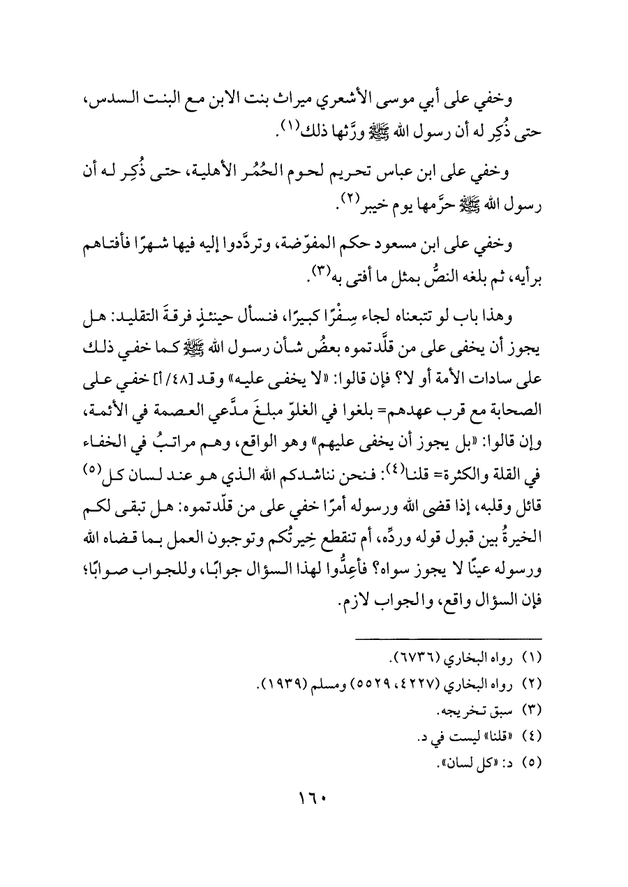 وهذا باب لو تتبعناه لجاء سِفْرًا كبيرًا، فنسأل حينئذٍ فرقةَ التقليد: هل يجوز أن يخفى على من قلَّدتموه بعضُ شأن رسول الله - صلى الله عليه وسلم - كما خفي ذلك على سادات الأمة أو لا؟ فإن قالوا: «لا يخفى عليه» وقد [٤٨/أ] خفي على الصحابة مع قرب عهدهم= بلغوا في الغلوّ مبلغَ مدَّعي العصمة في الأئمة، وإن قالوا: «بل يجوز أن يخفى عليهم» وهو الواقع، وهم مراتبُ في الخفاء في القلة والكثرة= قلنا (¬٤): فنحن نناشدكم الله الذي هو عند لسان كل (¬٥) قائل وقلبه، إذا قضى الله ورسوله أمرًا خفي على من قلّدتموه: هل تبقى لكم الخيرةُ بين قبول قوله وردِّه، أم تنقطع خِيرتُكم وتوجبون العمل بما قضاه الله ورسوله عينًا لا يجوز سواه؟ فأعِدُّوا لهذا السؤال جوابًا، وللجواب صوابًا؛ فإن السؤال واقع، والجواب لازم.