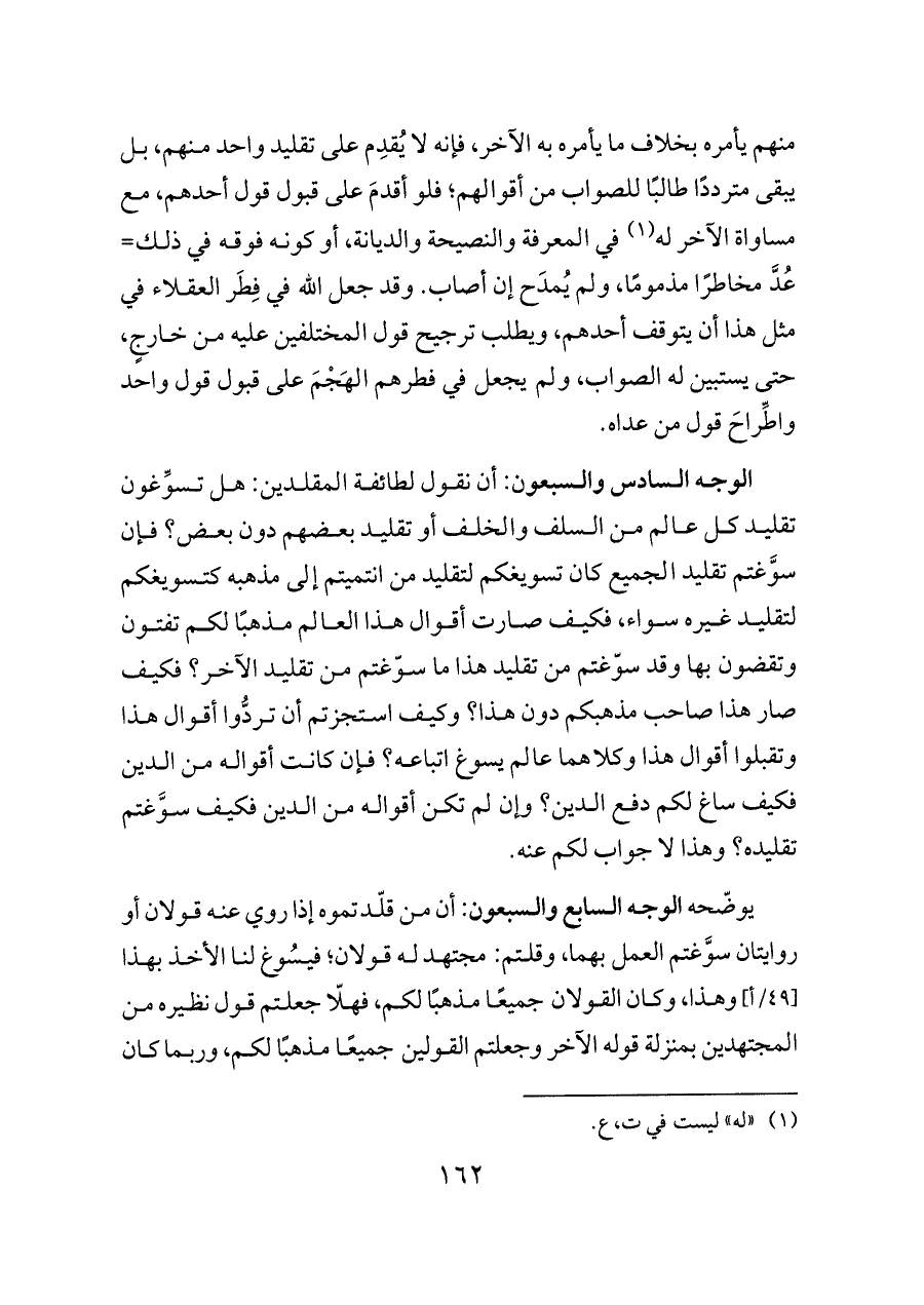 الوجه السادس والسبعون: أن نقول لطائفة المقلدين: هل تسوِّغون تقليد كل عالم من السلف والخلف أو تقليد بعضهم دون بعض؟ فإن سوَّغتم تقليد الجميع كان تسويغكم لتقليد من انتميتم إلى مذهبه كتسويغكم لتقليد غيره سواء، فكيف صارت أقوال هذا العالم مذهبًا لكم تفتون وتقضون بها وقد سوّغتم من تقليد هذا ما سوّغتم من تقليد الآخر؟ فكيف صار هذا صاحب مذهبكم دون هذا؟ وكيف استجزتم أن تردُّوا أقوال هذا وتقبلوا أقوال هذا وكلاهما عالم يسوغ اتباعه؟ فإن كانت أقواله من الدين فكيف ساغ لكم دفع الدين؟ وإن لم تكن أقواله من الدين فكيف سوَّغتم تقليده؟ وهذا لا جواب لكم عنه.