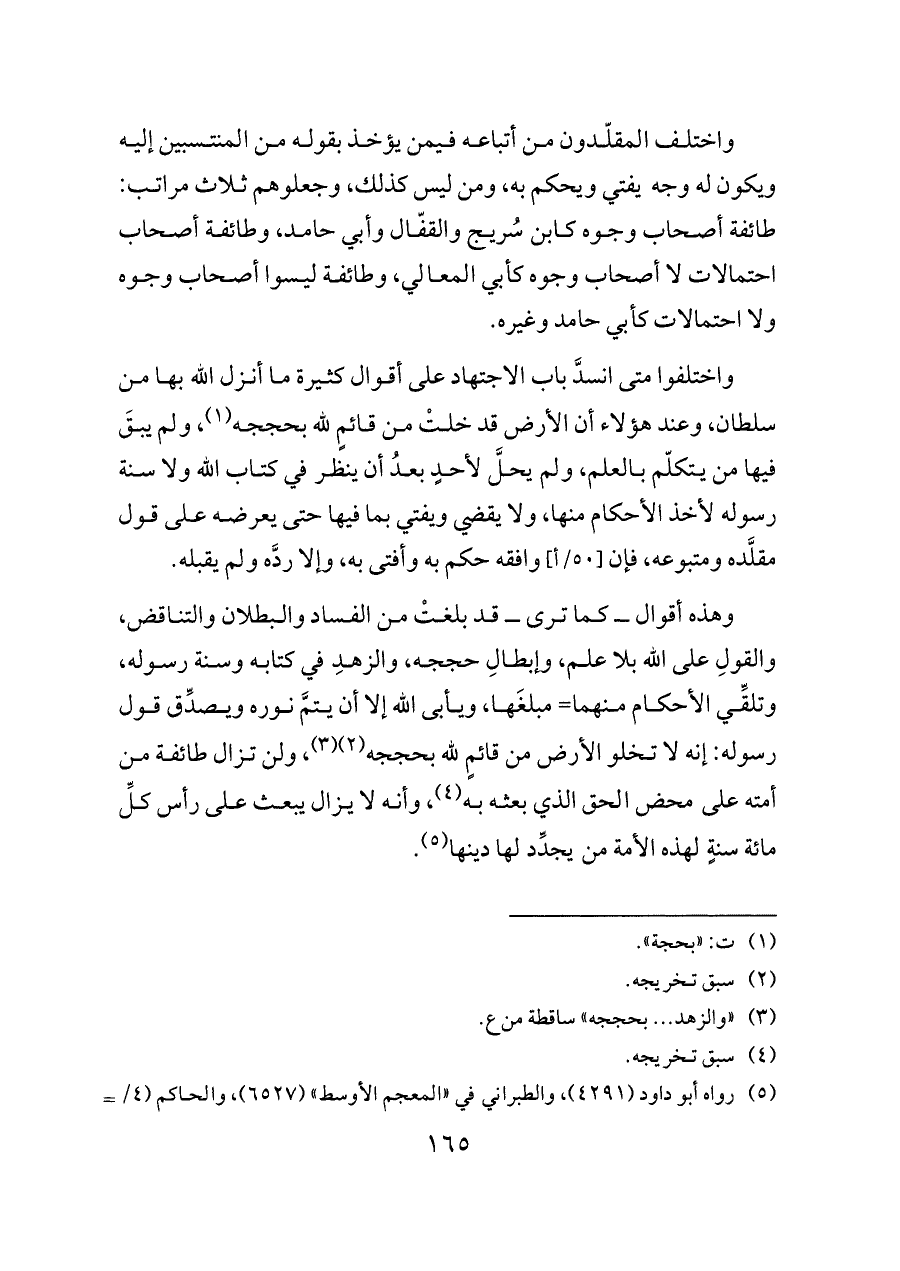 وهذه أقوال ــ كما ترى ــ قد بلغتْ من الفساد والبطلان والتناقض، والقولِ على الله بلا علم، وإبطالِ حججه، والزهدِ في كتابه وسنة رسوله، وتلقِّي الأحكام منهما= مبلغَها، ويأبى الله إلا أن يتمَّ نوره ويصدِّق قول رسوله: إنه لا تخلو الأرض من قائمٍ لله بحججه (¬٢) (¬٣)، ولن تزال طائفة من أمته على محض الحق الذي بعثه به (¬٤)، وأنه لا يزال يبعث على رأس كلِّ مائة سنةٍ لهذه الأمة من يجدِّد لها دينها (¬٥).
