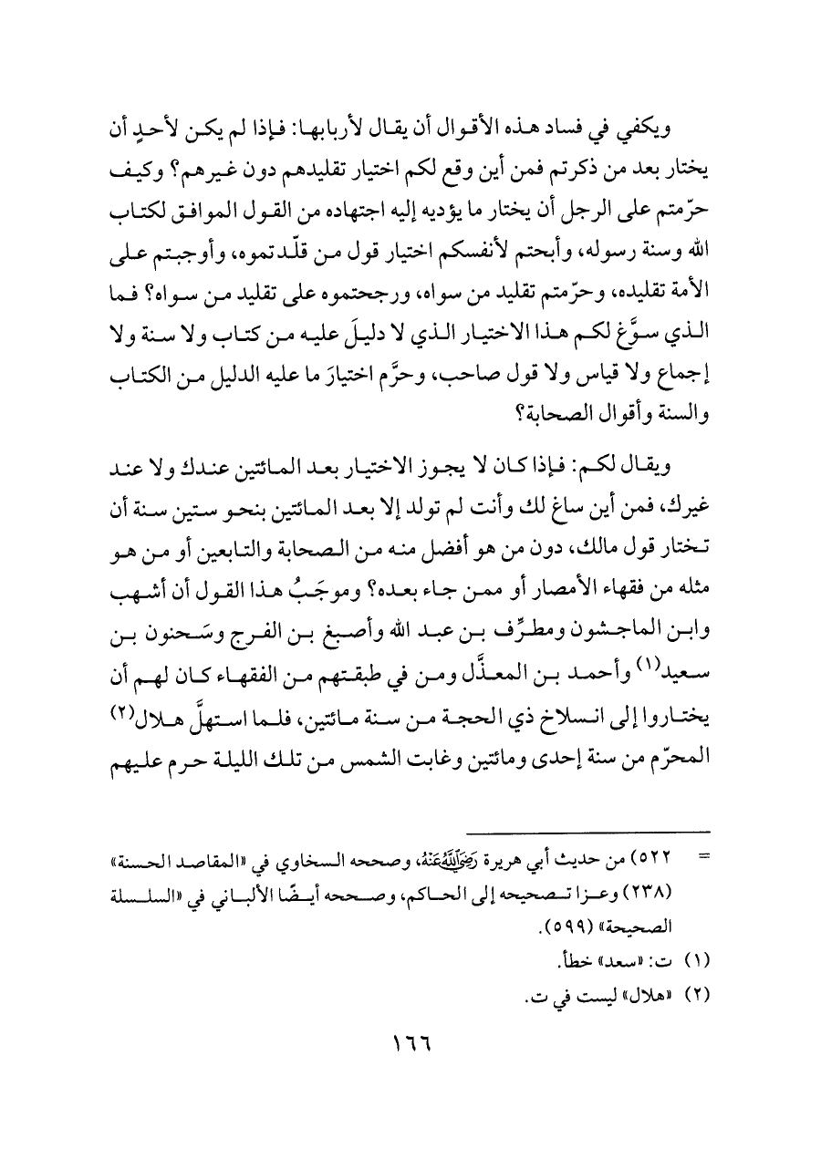 ويقال لكم: فإذا كان لا يجوز الاختيار بعد المائتين عندك ولا عند غيرك، فمن أين ساغ لك وأنت لم تولد إلا بعد المائتين بنحو ستين سنة أن تختار قول مالك، دون من هو أفضل منه من الصحابة والتابعين أو من هو مثله من فقهاء الأمصار أو ممن جاء بعده؟ وموجَبُ هذا القول أن أشهب وابن الماجشون ومطرِّف بن عبد الله وأصبغ بن الفرج وسَحنون بن سعيد (¬١) وأحمد بن المعذَّل ومن في طبقتهم من الفقهاء كان لهم أن يختاروا إلى انسلاخ ذي الحجة من سنة مائتين، فلما استهلَّ هلال (¬٢) المحرّم من سنة إحدى ومائتين وغابت الشمس من تلك الليلة حرم عليهم