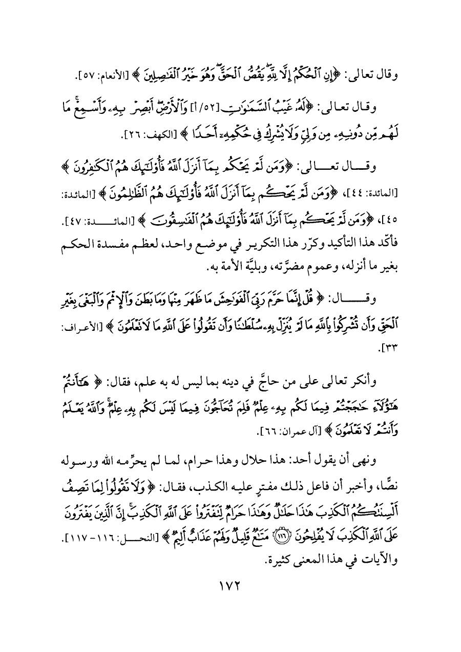 ونهى أن يقول أحد: هذا حلال وهذا حرام، لما لم يحرِّمه الله ورسوله نصًّا، وأخبر أن فاعل ذلك مفترٍ عليه الكذب، فقال: {وَلَا تَقُولُوا لِمَا تَصِفُ أَلْسِنَتُكُمُ الْكَذِبَ هَذَا حَلَالٌ وَهَذَا حَرَامٌ لِتَفْتَرُوا عَلَى اللَّهِ الْكَذِبَ إِنَّ الَّذِينَ يَفْتَرُونَ عَلَى اللَّهِ الْكَذِبَ لَا يُفْلِحُونَ (١١٦) مَتَاعٌ قَلِيلٌ وَلَهُمْ عَذَابٌ أَلِيمٌ} [النحل: ١١٦ - ١١٧]. والآيات في هذا المعنى كثيرة.