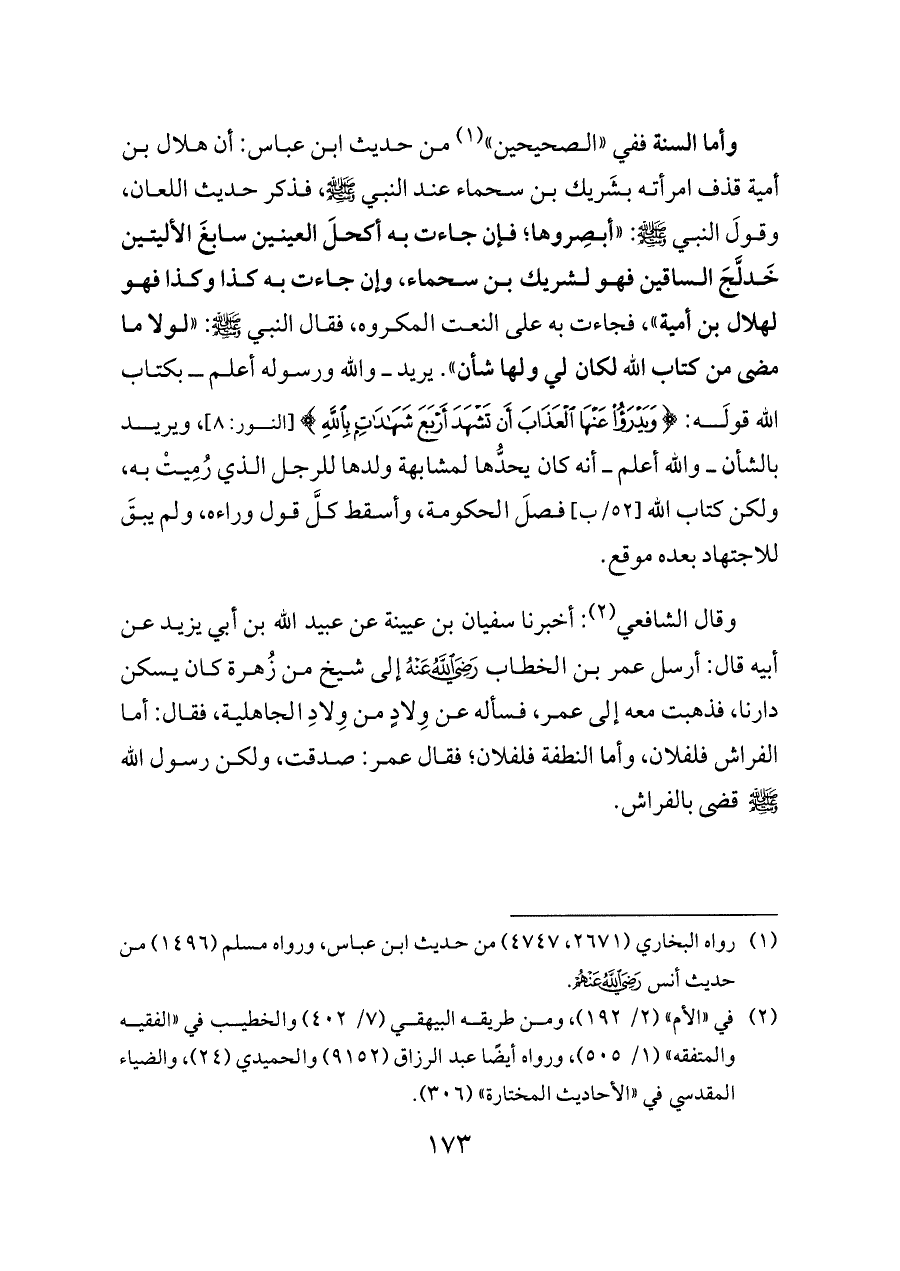 وأما السنة ففي «الصحيحين» (¬١) من حديث ابن عباس: أن هلال بن أمية قذف امرأته بشَريك بن سحماء عند النبي - صلى الله عليه وسلم -، فذكر حديث اللعان، وقولَ النبي - صلى الله عليه وسلم -: «أبصِروها؛ فإن جاءت به أكحلَ العينين سابغَ الأليتين خَدلَّجَ الساقين فهو لشريك بن سحماء، وإن جاءت به كذا وكذا فهو لهلال بن أمية»، فجاءت به على النعت المكروه، فقال النبي - صلى الله عليه وسلم -: «لولا ما مضى من كتاب الله لكان لي ولها شأن». يريد ــ والله ورسوله أعلم ــ بكتاب الله قولَه: {وَيَدْرَأُ عَنْهَا الْعَذَابَ أَنْ تَشْهَدَ أَرْبَعَ شَهَادَاتٍ بِاللَّهِ} [النور: ٨]، ويريد بالشأن ــ والله أعلم ــ أنه كان يحدُّها لمشابهة ولدها للرجل الذي رُمِيتْ به، ولكن كتاب الله [٥٢/ب] فصلَ الحكومة، وأسقط كلَّ قول وراءه، ولم يبقَ للاجتهاد بعده موقع.