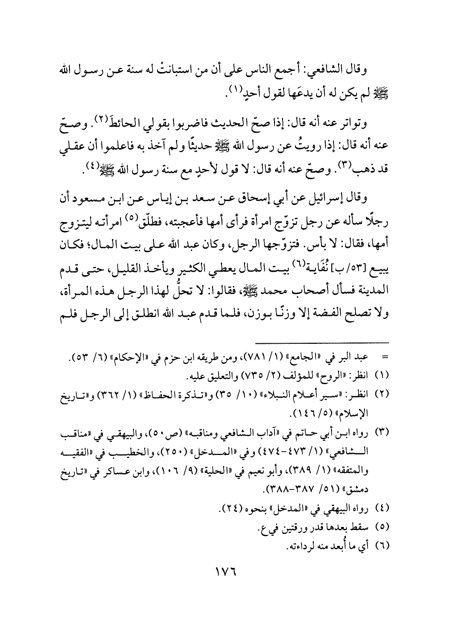 (¬٣) رواه ابن أبي حاتم في «آداب الشافعي ومناقبه» (ص ٥٠)، والبيهقي في «مناقب الشافعي» (١/ ٤٧٣ - ٤٧٤) وفي «المدخل» (٢٥٠)، والخطيب في «الفقيه والمتفقه» (١/ ٣٨٩)، وأبو نعيم في «الحلية» (٩/ ١٠٦)، وابن عساكر في «تاريخ دمشق» (٥١/ ٣٨٧ - ٣٨٨).