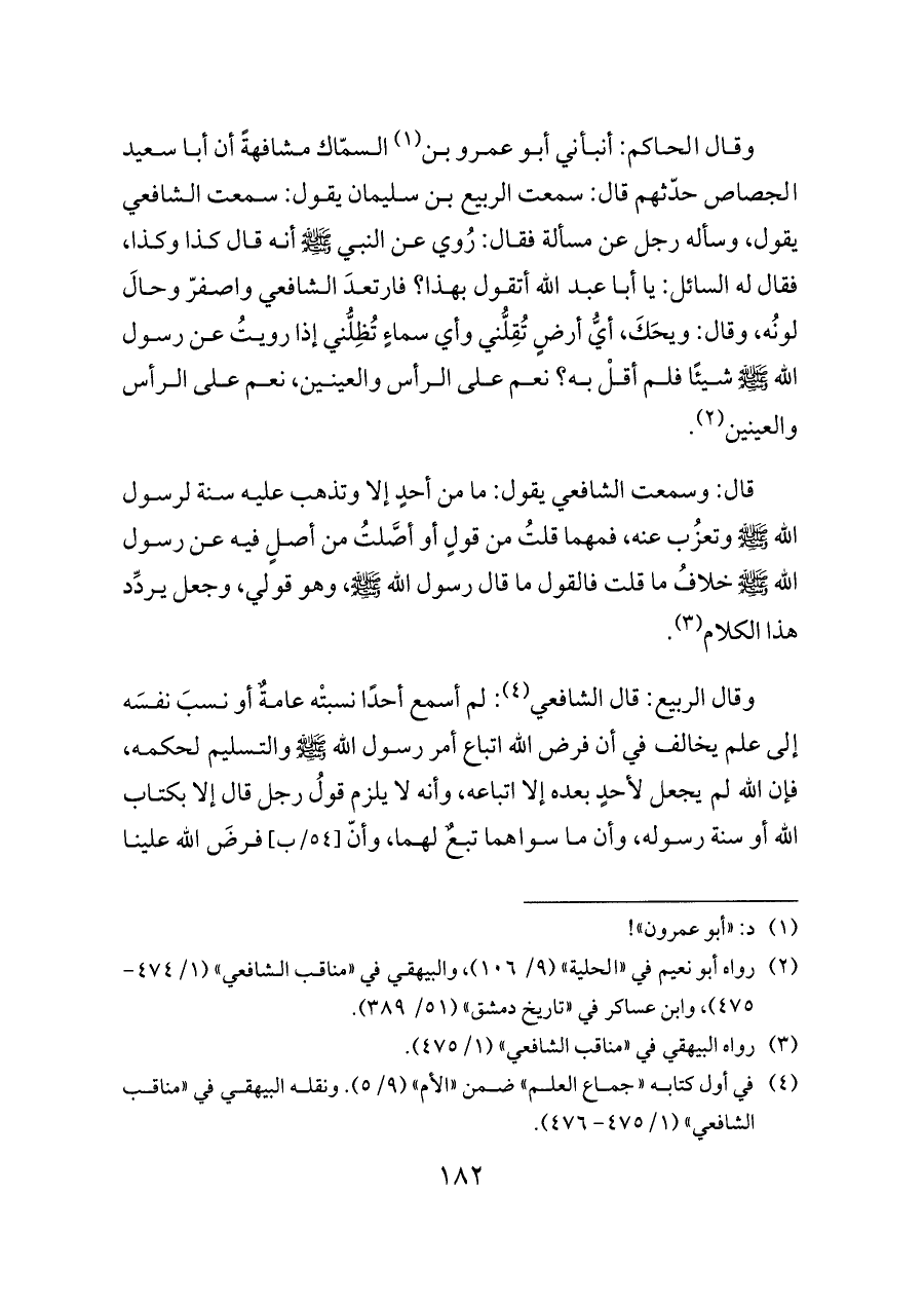 وقال الحاكم: أنبأني أبو عمرو بن (¬١) السمّاك مشافهةً أن أبا سعيد الجصاص حدّثهم قال: سمعت الربيع بن سليمان يقول: سمعت الشافعي يقول، وسأله رجل عن مسألة فقال: رُوي عن النبي - صلى الله عليه وسلم - أنه قال كذا وكذا، فقال له السائل: يا أبا عبد الله أتقول بهذا؟ فارتعدَ الشافعي واصفرّ وحالَ لونُه، وقال: ويحَكَ، أيُّ أرضٍ تُقِلُّني وأي سماءٍ تُظِلُّني إذا رويتُ عن رسول الله - صلى الله عليه وسلم - شيئًا فلم أقلْ به؟ نعم على الرأس والعينين، نعم على الرأس والعينين (¬٢).
