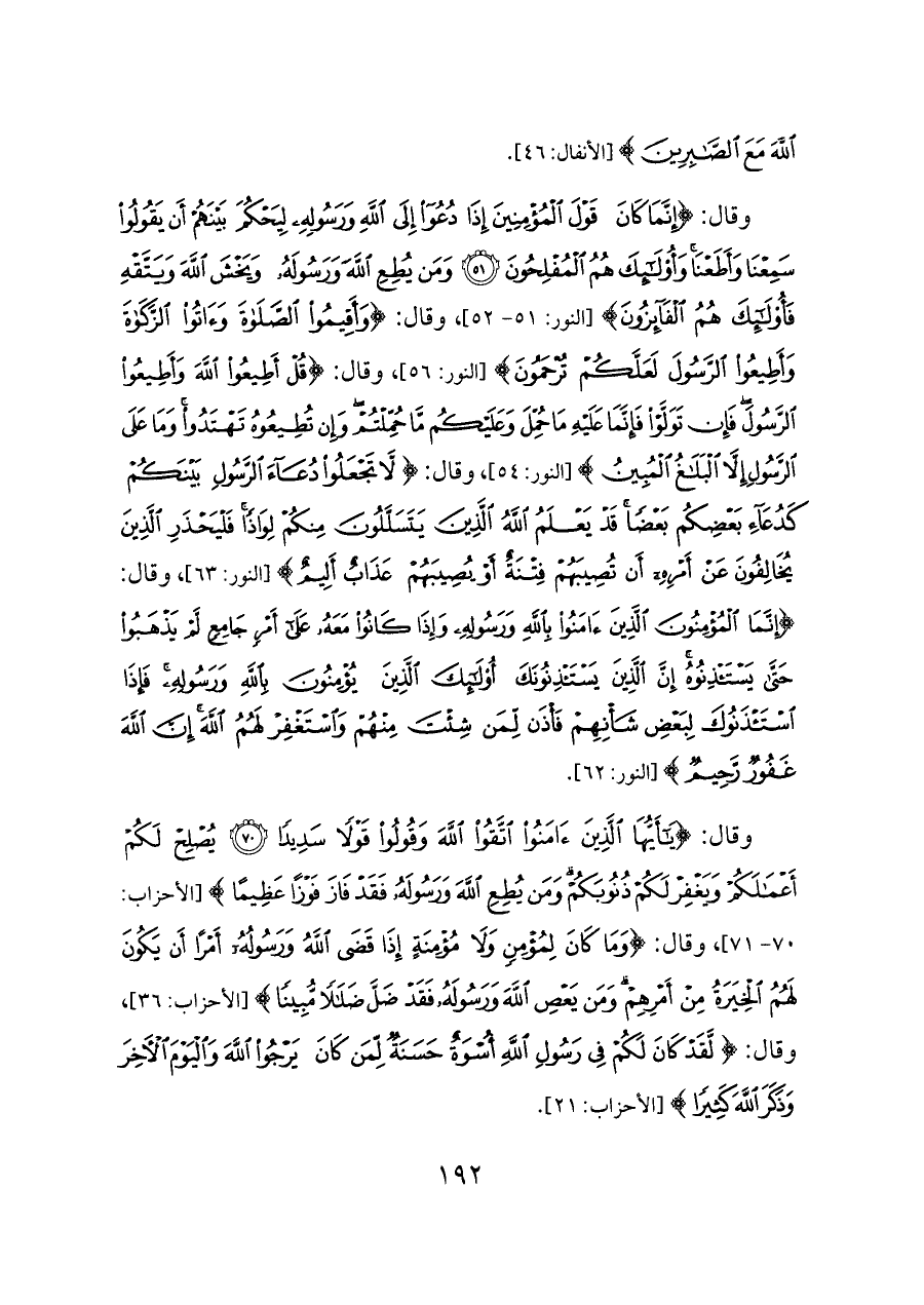 وقال: {إِنَّمَا كَانَ قَوْلَ الْمُؤْمِنِينَ إِذَا دُعُوا إِلَى اللَّهِ وَرَسُولِهِ لِيَحْكُمَ بَيْنَهُمْ أَنْ يَقُولُوا سَمِعْنَا وَأَطَعْنَا وَأُولَئِكَ هُمُ الْمُفْلِحُونَ (٥١) وَمَنْ يُطِعِ اللَّهَ وَرَسُولَهُ وَيَخْشَ اللَّهَ وَيَتَّقْهِ فَأُولَئِكَ هُمُ الْفَائِزُونَ} [النور: ٥١ - ٥٢]، وقال: {وَأَقِيمُوا الصَّلَاةَ وَآتُوا الزَّكَاةَ وَأَطِيعُوا الرَّسُولَ لَعَلَّكُمْ تُرْحَمُونَ} [النور: ٥٦]، وقال: {قُلْ أَطِيعُوا اللَّهَ وَأَطِيعُوا الرَّسُولَ فَإِنْ تَوَلَّوْا فَإِنَّمَا عَلَيْهِ مَا حُمِّلَ وَعَلَيْكُمْ مَا حُمِّلْتُمْ وَإِنْ تُطِيعُوهُ تَهْتَدُوا وَمَا عَلَى الرَّسُولِ إِلَّا الْبَلَاغُ الْمُبِينُ} [النور: ٥٤]، وقال: {لَا تَجْعَلُوا دُعَاءَ الرَّسُولِ بَيْنَكُمْ كَدُعَاءِ بَعْضِكُمْ بَعْضًا قَدْ يَعْلَمُ اللَّهُ الَّذِينَ يَتَسَلَّلُونَ مِنْكُمْ لِوَاذًا فَلْيَحْذَرِ الَّذِينَ يُخَالِفُونَ عَنْ أَمْرِهِ أَنْ تُصِيبَهُمْ فِتْنَةٌ أَوْ يُصِيبَهُمْ عَذَابٌ أَلِيمٌ} [النور: ٦٣]، وقال: {إِنَّمَا الْمُؤْمِنُونَ الَّذِينَ آمَنُوا بِاللَّهِ وَرَسُولِهِ وَإِذَا كَانُوا مَعَهُ عَلَى أَمْرٍ جَامِعٍ لَمْ يَذْهَبُوا حَتَّى يَسْتَأْذِنُوهُ إِنَّ الَّذِينَ يَسْتَأْذِنُونَكَ أُولَئِكَ الَّذِينَ يُؤْمِنُونَ بِاللَّهِ وَرَسُولِهِ فَإِذَا اسْتَأْذَنُوكَ لِبَعْضِ شَأْنِهِمْ فَأْذَنْ لِمَنْ شِئْتَ مِنْهُمْ وَاسْتَغْفِرْ لَهُمُ اللَّهَ إِنَّ اللَّهَ غَفُورٌ رَحِيمٌ} [النور: ٦٢].