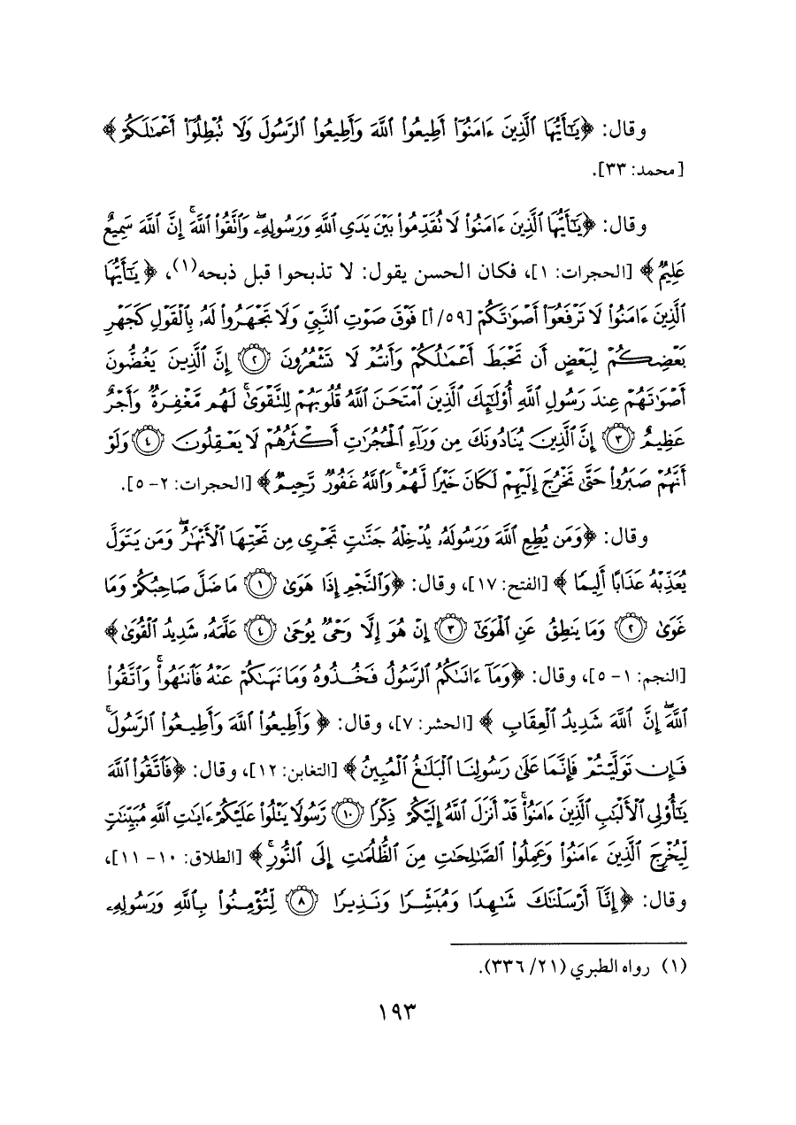 وقال: {وَمَنْ يُطِعِ اللَّهَ وَرَسُولَهُ يُدْخِلْهُ جَنَّاتٍ تَجْرِي مِنْ تَحْتِهَا الْأَنْهَارُ وَمَنْ يَتَوَلَّ يُعَذِّبْهُ عَذَابًا أَلِيمًا} [الفتح: ١٧]، وقال: {وَالنَّجْمِ إِذَا هَوَى (١) مَا ضَلَّ صَاحِبُكُمْ وَمَا غَوَى (٢) وَمَا يَنْطِقُ عَنِ الْهَوَى (٣) إِنْ هُوَ إِلَّا وَحْيٌ يُوحَى (٤) عَلَّمَهُ شَدِيدُ الْقُوَى} [النجم: ١ - ٥]، وقال: {وَمَا آتَاكُمُ الرَّسُولُ فَخُذُوهُ وَمَا نَهَاكُمْ عَنْهُ فَانْتَهُوا وَاتَّقُوا اللَّهَ إِنَّ اللَّهَ شَدِيدُ الْعِقَابِ} [الحشر: ٧]، وقال: {وَأَطِيعُوا اللَّهَ وَأَطِيعُوا الرَّسُولَ فَإِنْ تَوَلَّيْتُمْ فَإِنَّمَا عَلَى رَسُولِنَا الْبَلَاغُ الْمُبِينُ} [التغابن: ١٢]، وقال: {فَاتَّقُوا اللَّهَ يَاأُولِي الْأَلْبَابِ الَّذِينَ آمَنُوا قَدْ أَنْزَلَ اللَّهُ إِلَيْكُمْ ذِكْرًا (١٠) رَسُولًا يَتْلُو عَلَيْكُمْ آيَاتِ اللَّهِ مُبَيِّنَاتٍ لِيُخْرِجَ الَّذِينَ آمَنُوا وَعَمِلُوا الصَّالِحَاتِ مِنَ الظُّلُمَاتِ إِلَى النُّورِ} [الطلاق: ١٠ - ١١]، وقال: {إِنَّا أَرْسَلْنَاكَ شَاهِدًا وَمُبَشِّرًا وَنَذِيرًا (٨) لِتُؤْمِنُوا بِاللَّهِ وَرَسُولِهِ