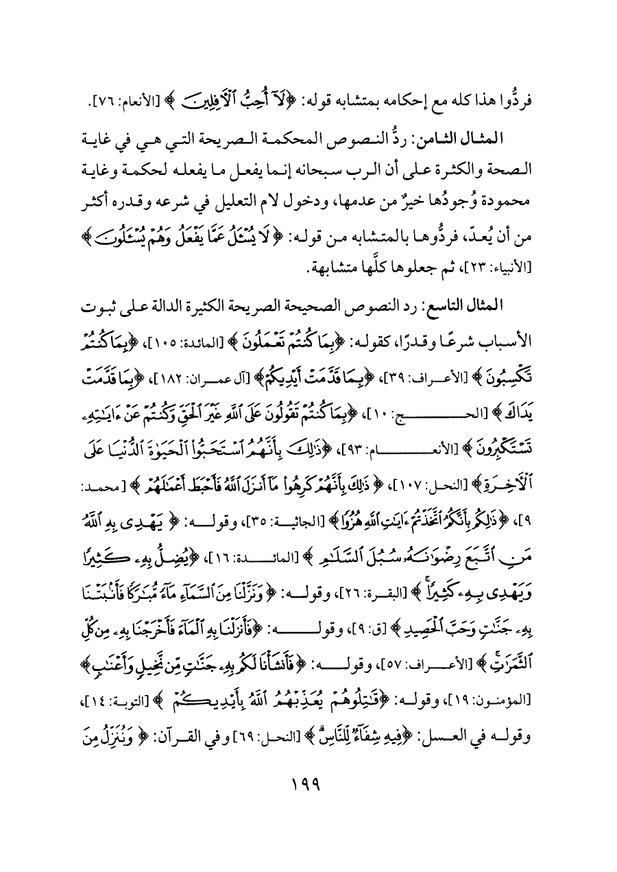 المثال التاسع: رد النصوص الصحيحة الصريحة الكثيرة الدالة على ثبوت الأسباب شرعًا وقدرًا، كقوله: {بِمَا كُنْتُمْ تَعْمَلُونَ} [المائدة: ١٠٥]، {بِمَا كُنْتُمْ تَكْسِبُونَ} [الأعراف: ٣٩]، {بِمَا قَدَّمَتْ أَيْدِيكُمْ} [آل عمران: ١٨٢]، {بِمَا قَدَّمَتْ يَدَاكَ} [الحج: ١٠]، {بِمَا كُنْتُمْ تَقُولُونَ عَلَى اللَّهِ غَيْرَ الْحَقِّ وَكُنْتُمْ عَنْ آيَاتِهِ تَسْتَكْبِرُونَ} [الأنعام: ٩٣]، {ذَلِكَ بِأَنَّهُمُ اسْتَحَبُّوا الْحَيَاةَ الدُّنْيَا عَلَى الْآخِرَةِ} [النحل: ١٠٧]، {ذَلِكَ بِأَنَّهُمْ كَرِهُوا مَا أَنْزَلَ اللَّهُ فَأَحْبَطَ أَعْمَالَهُمْ} [محمد: ٩]، {ذَلِكُمْ بِأَنَّكُمُ اتَّخَذْتُمْ آيَاتِ اللَّهِ هُزُوًا} [الجاثية: ٣٥]، وقوله: {يَهْدِي بِهِ اللَّهُ مَنِ اتَّبَعَ رِضْوَانَهُ سُبُلَ السَّلَامِ} [المائدة: ١٦]، {يُضِلُّ بِهِ كَثِيرًا وَيَهْدِي بِهِ كَثِيرًا} [البقرة: ٢٦]، وقوله: {وَنَزَّلْنَا مِنَ السَّمَاءِ مَاءً مُبَارَكًا فَأَنْبَتْنَا بِهِ جَنَّاتٍ وَحَبَّ الْحَصِيدِ} [ق: ٩]، وقوله: {فَأَنْزَلْنَا بِهِ الْمَاءَ فَأَخْرَجْنَا بِهِ مِنْ كُلِّ الثَّمَرَاتِ} [الأعراف: ٥٧]، وقوله: {فَأَنْشَأْنَا لَكُمْ بِهِ جَنَّاتٍ مِنْ نَخِيلٍ وَأَعْنَابٍ} [المؤمنون: ١٩]، وقوله: {قَاتِلُوهُمْ يُعَذِّبْهُمُ اللَّهُ بِأَيْدِيكُمْ} [التوبة: ١٤]، وقوله في العسل: {فِيهِ شِفَاءٌ لِلنَّاسِ} [النحل: ٦٩] وفي القرآن: {وَنُنَزِّلُ مِنَ