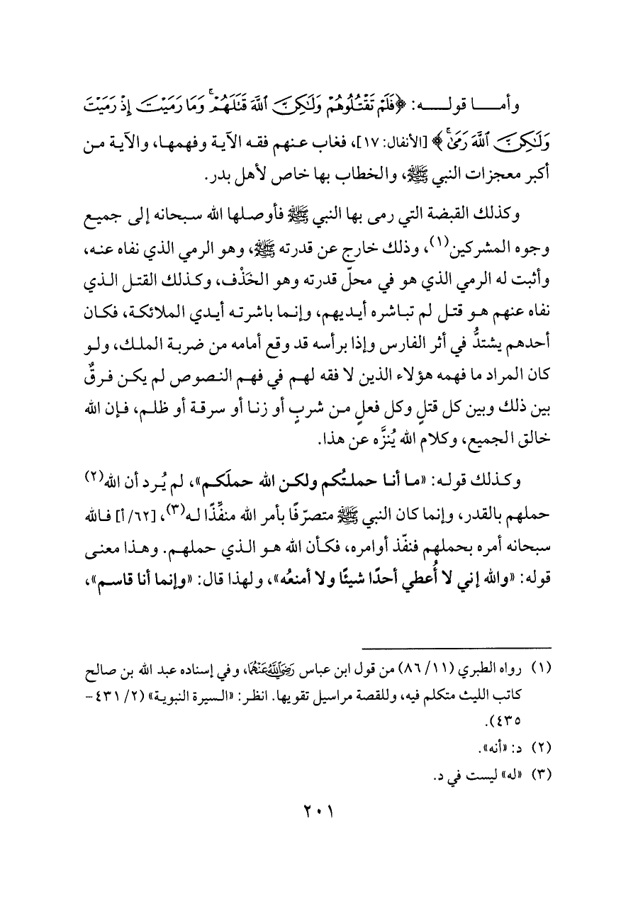 وكذلك القبضة التي رمى بها النبي - صلى الله عليه وسلم - فأوصلها الله سبحانه إلى جميع وجوه المشركين (¬١)، وذلك خارج عن قدرته - صلى الله عليه وسلم -، وهو الرمي الذي نفاه عنه، وأثبت له الرمي الذي هو في محلّ قدرته وهو الخَذْف، وكذلك القتل الذي نفاه عنهم هو قتل لم تباشره أيديهم، وإنما باشرته أيدي الملائكة، فكان أحدهم يشتدُّ في أثر الفارس وإذا برأسه قد وقع أمامه من ضربة الملك، ولو كان المراد ما فهمه هؤلاء الذين لا فقه لهم في فهم النصوص لم يكن فرقٌ بين ذلك وبين كل قتلٍ وكل فعلٍ من شربٍ أو زنا أو سرقة أو ظلم، فإن الله خالق الجميع، وكلام الله يُنزَّه عن هذا.