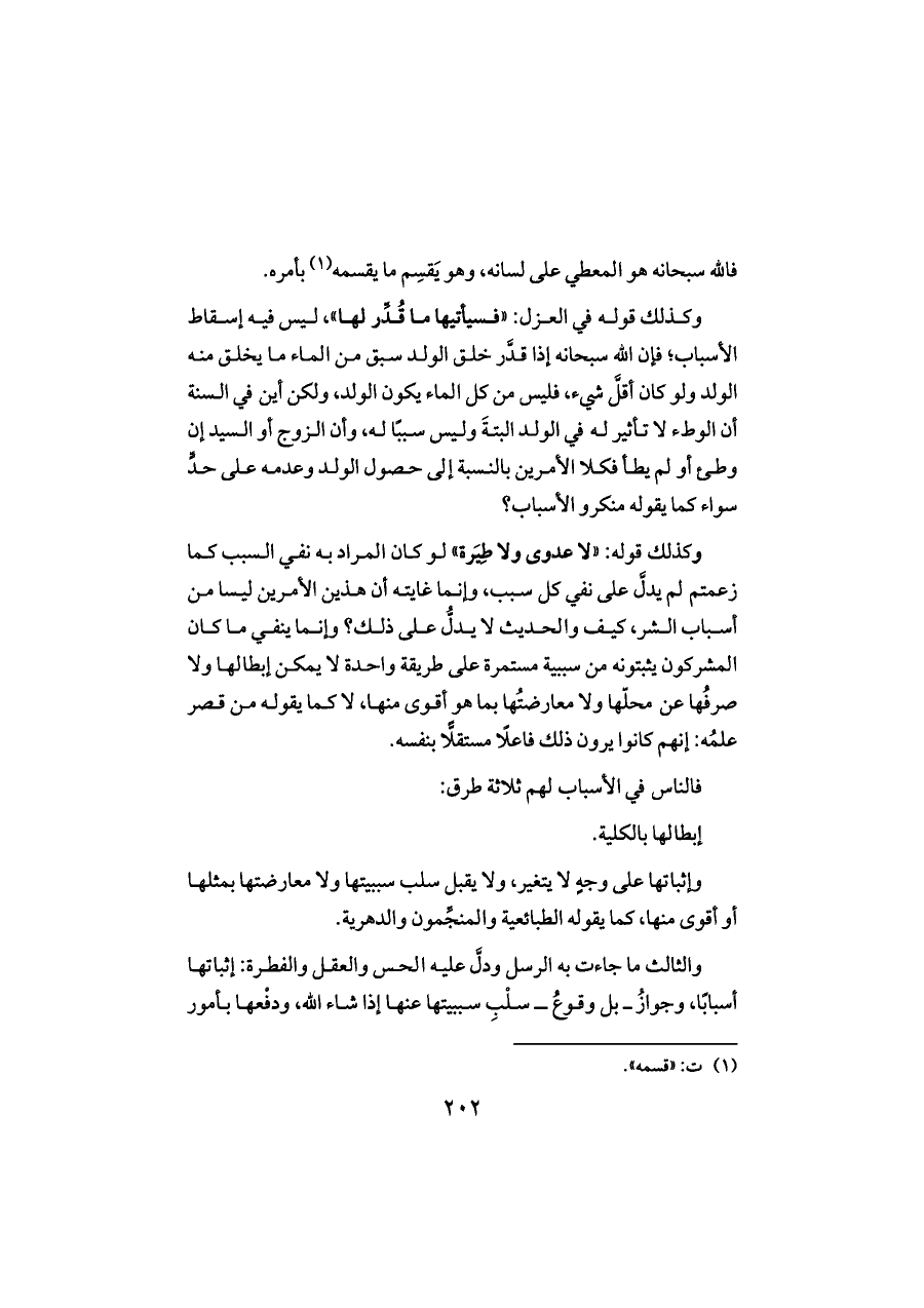 وكذلك قوله: «لا عدوى ولا طِيَرة» لو كان المراد به نفي السبب كما زعمتم لم يدلَّ على نفي كل سبب، وإنما غايته أن هذين الأمرين ليسا من أسباب الشر، كيف والحديث لا يدلُّ على ذلك؟ وإنما ينفي ما كان المشركون يثبتونه من سببية مستمرة على طريقة واحدة لا يمكن إبطالها ولا صرفُها عن محلّها ولا معارضتُها بما هو أقوى منها، لا كما يقوله من قصر علمُه: إنهم كانوا يرون ذلك فاعلًا مستقلًّا بنفسه.