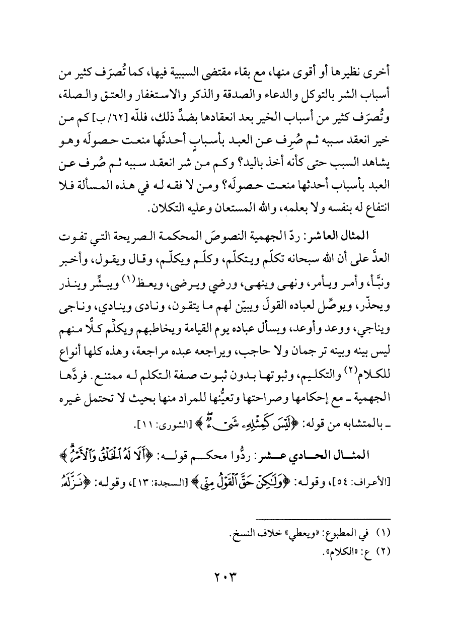 المثال الحادي عشر: ردُّوا محكم قوله: {أَلَا لَهُ الْخَلْقُ وَالْأَمْرُ} [الأعراف: ٥٤]، وقوله: {وَلَكِنْ حَقَّ الْقَوْلُ مِنِّي} [السجدة: ١٣]، وقوله: {نَزَّلَهُ