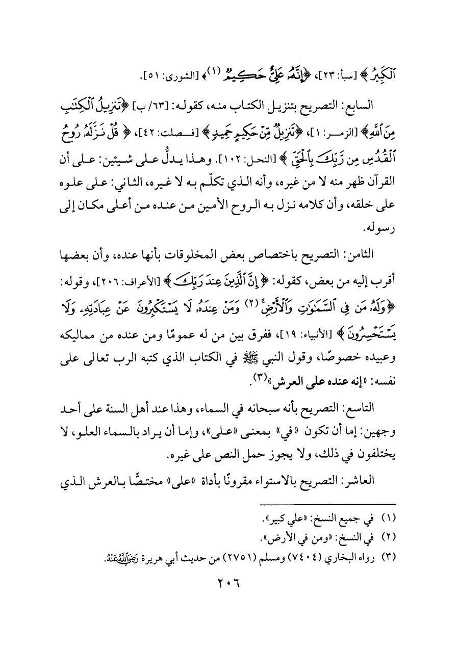 الثامن: التصريح باختصاص بعض المخلوقات بأنها عنده، وأن بعضها أقرب إليه من بعض، كقوله: {إِنَّ الَّذِينَ عِنْدَ رَبِّكَ} [الأعراف: ٢٠٦]، وقوله: {وَلَهُ مَنْ فِي السَّمَاوَاتِ وَالْأَرْضِ (¬٢) وَمَنْ عِنْدَهُ لَا يَسْتَكْبِرُونَ عَنْ عِبَادَتِهِ وَلَا يَسْتَحْسِرُونَ} [الأنبياء: ١٩]، ففرق بين من له عمومًا ومن عنده من مماليكه وعبيده خصوصًا، وقول النبي - صلى الله عليه وسلم - في الكتاب الذي كتبه الرب تعالى على نفسه: «إنه عنده على العرش» (¬٣).