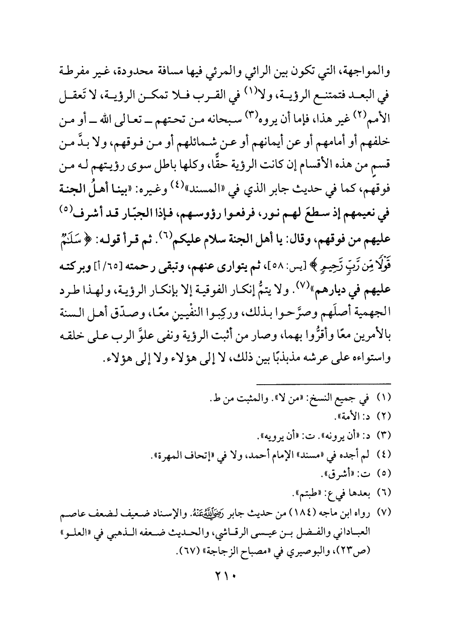 والمواجهة، التي تكون بين الرائي والمرئي فيها مسافة محدودة، غير مفرطة في البعد فتمتنع الرؤية، ولا (¬١) في القرب فلا تمكن الرؤية، لا تَعقل الأمم (¬٢) غير هذا، فإما أن يروه (¬٣) سبحانه من تحتهم ــ تعالى الله ــ أو من خلفهم أو أمامهم أو عن أيمانهم أو عن شمائلهم أو من فوقهم، ولا بدَّ من قسمٍ من هذه الأقسام إن كانت الرؤية حقًّا، وكلها باطل سوى رؤيتهم له من فوقهم، كما في حديث جابر الذي في «المسند» (¬٤) وغيره: «بينا أهلُ الجنة في نعيمهم إذ سطعَ لهم نور، فرفعوا رؤوسهم، فإذا الجبّار قد أشرف (¬٥) عليهم من فوقهم، وقال: يا أهل الجنة سلام عليكم (¬٦). ثم قرأ قوله: {سَلَامٌ قَوْلًا مِنْ رَبٍّ رَحِيمٍ} [يس: ٥٨]، ثم يتوارى عنهم، وتبقى رحمته [٦٥/أ] وبركته عليهم في ديارهم» (¬٧).