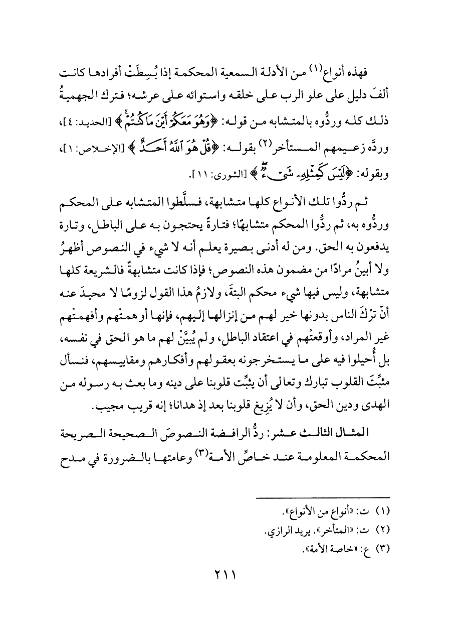 ثم ردُّوا تلك الأنواع كلها متشابهة، فسلَّطوا المتشابه على المحكم وردُّوه به، ثم ردُّوا المحكم متشابهًا؛ فتارةً يحتجون به على الباطل، وتارة يدفعون به الحق. ومن له أدنى بصيرة يعلم أنه لا شيء في النصوص أظهرُ ولا أبينُ مرادًا من مضمون هذه النصوص؛ فإذا كانت متشابهةً فالشريعة كلها متشابهة، وليس فيها شيء محكم البتةَ، ولازمُ هذا القول لزومًا لا محيدَ عنه أنّ ترْكَ الناس بدونها خير لهم من إنزالها إليهم، فإنها أوهمتْهم وأفهمتْهم غير المراد، وأوقعتْهم في اعتقاد الباطل، ولم يُبيَّنْ لهم ما هو الحق في نفسه، بل أُحيلوا فيه على ما يستخرجونه بعقولهم وأفكارهم ومقاييسهم، فنسأل مثبِّتَ القلوب تبارك وتعالى أن يثبِّت قلوبنا على دينه وما بعث به رسوله من الهدى ودين الحق، وأن لا يُزِيغ قلوبنا بعد إذ هدانا؛ إنه قريب مجيب.
