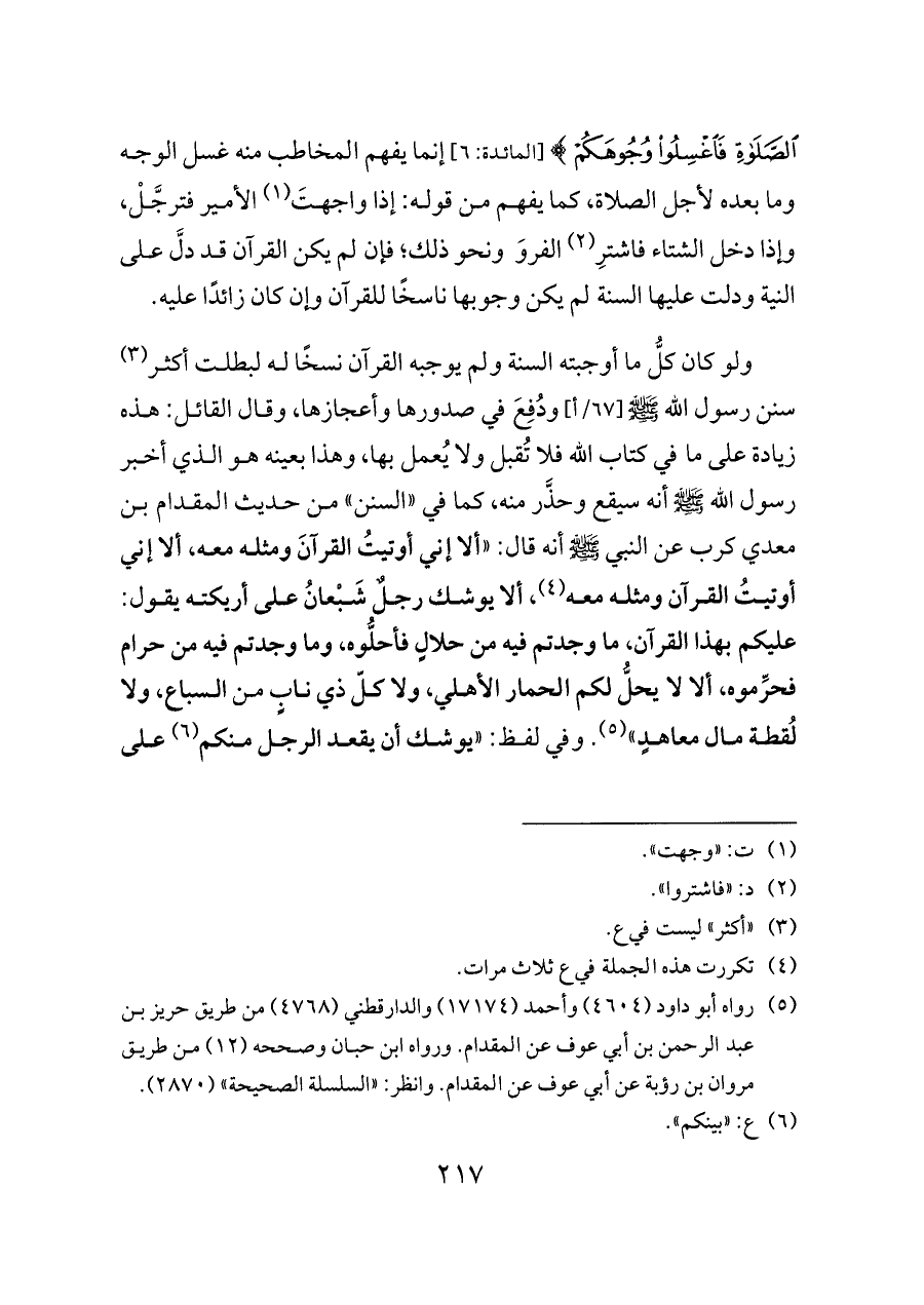 ولو كان كلُّ ما أوجبته السنة ولم يوجبه القرآن نسخًا له لبطلت أكثر (¬٣) سنن رسول الله - صلى الله عليه وسلم -[٦٧/أ] ودُفِعَ في صدورها وأعجازها، وقال القائل: هذه زيادة على ما في كتاب الله فلا تُقبل ولا يُعمل بها، وهذا بعينه هو الذي أخبر رسول الله - صلى الله عليه وسلم - أنه سيقع وحذَّر منه، كما في «السنن» من حديث المقدام بن معدي كرب عن النبي - صلى الله عليه وسلم - أنه قال: «ألا إني أوتيتُ القرآنَ ومثله معه، ألا إني أوتيتُ القرآن ومثله معه (¬٤)، ألا يوشك رجلٌ شَبْعانُ على أريكته يقول: عليكم بهذا القرآن، ما وجدتم فيه من حلالٍ فأحلُّوه، وما وجدتم فيه من حرام فحرِّموه، ألا لا يحلُّ لكم الحمار الأهلي، ولا كلّ ذي نابٍ من السباع، ولا لُقطة مال معاهدٍ» (¬٥). وفي لفظ: «يوشك أن يقعد الرجل منكم (¬٦) على