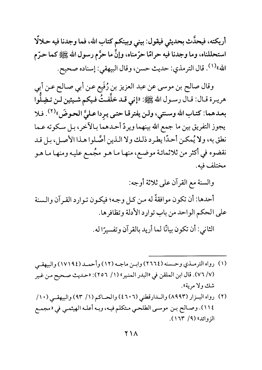 (¬١) رواه الترمذي وحسنه (٢٦٦٤) وابن ماجه (١٢) وأحمد (١٧١٩٤) والبيهقي (٧/ ٧٦). قال ابن الملقن في «البدر المنير» (١/ ٢٥٦): «حديث صحيح من غير شك ولا مرية».