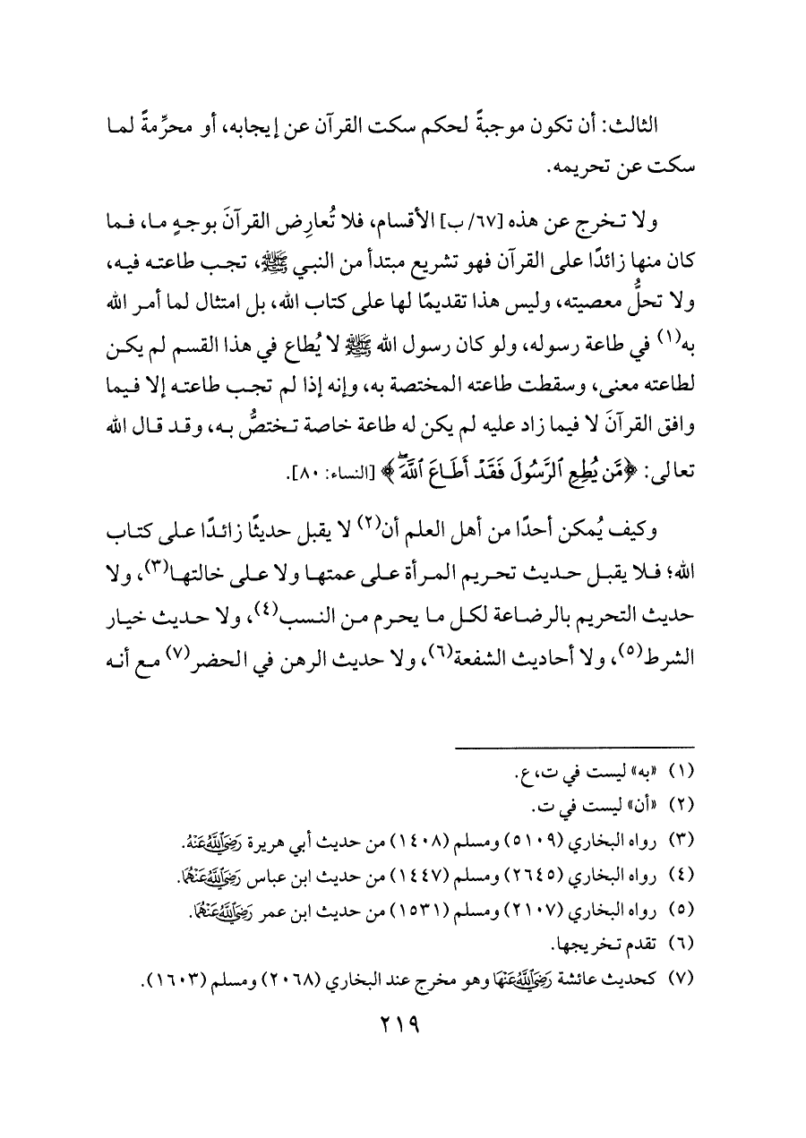 ولا تخرج عن هذه [٦٧/ب] الأقسام، فلا تُعارِض القرآنَ بوجهٍ ما، فما كان منها زائدًا على القرآن فهو تشريع مبتدأ من النبي - صلى الله عليه وسلم -، تجب طاعته فيه، ولا تحلُّ معصيته، وليس هذا تقديمًا لها على كتاب الله، بل امتثال لما أمر الله به (¬١) في طاعة رسوله، ولو كان رسول الله - صلى الله عليه وسلم - لا يُطاع في هذا القسم لم يكن لطاعته معنى، وسقطت طاعته المختصة به، وإنه إذا لم تجب طاعته إلا فيما وافق القرآنَ لا فيما زاد عليه لم يكن له طاعة خاصة تختصُّ به، وقد قال الله تعالى: {مَنْ يُطِعِ الرَّسُولَ فَقَدْ أَطَاعَ اللَّهَ} [النساء: ٨٠].