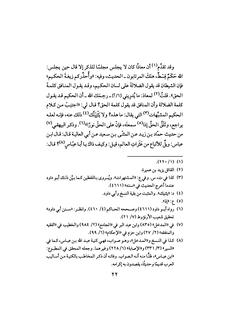 وقد تقدَّم (¬١) أن معاذًا كان لا يجلس مجلسًا للذكر إلا قال حين يجلس: الله حَكَمٌ قِسْطٌ، هلكَ المرتابون ــ الحديث، وفيه: «وأُحذِّركم زيغةَ الحكيم؛ فإن الشيطان قد يقول الضلالةَ على لسان الحكيم، وقد يقول المنافق كلمةَ الحق». قلتُ (¬٢) لمعاذ: ما يُدرِيني [٦/أ]ــ رحِمَك الله ــ أن الحكيم قد يقول كلمة الضلالة وأن المنافق قد يقول كلمة الحق؟ قال لي: «اجتنِبْ من كلام الحكيم المشبَّهات (¬٣) التي يقال: ما هذه؟ ولا يَثْنِيَنَّك (¬٤) ذلك عنه، فإنه لعله يراجع، وتَلَقَّ الحقَّ إذا (¬٥) سمعتَه، فإنّ على الحقّ نورًا» (¬٦). وذكر البيهقي (¬٧) من حديث حمّاد بن زيد عن المثنّى بن سعيد عن أبي العالية قال: قال ابن عباس: ويلٌ للأتباع من عَثَراتِ العالم، قيل: وكيف ذاك يا أبا عبّاسٍ (¬٨)؟ قال: