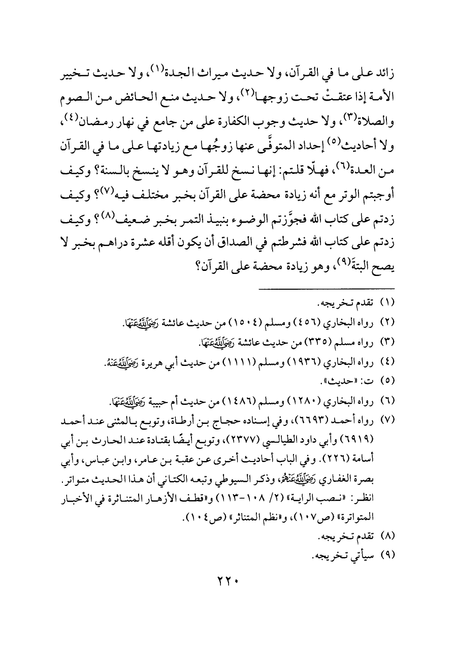 زائد على ما في القرآن، ولا حديث ميراث الجدة (¬١)، ولا حديث تخيير الأمة إذا عتقتْ تحت زوجها (¬٢)، ولا حديث منع الحائض من الصوم والصلاة (¬٣)، ولا حديث وجوب الكفارة على من جامع في نهار رمضان (¬٤)، ولا أحاديث (¬٥) إحداد المتوفَّى عنها زوجُها مع زيادتها على ما في القرآن من العدة (¬٦)، فهلّا قلتم: إنها نسخ للقرآن وهو لا ينسخ بالسنة؟ وكيف أوجبتم الوتر مع أنه زيادة محضة على القرآن بخبر مختلف فيه (¬٧)؟